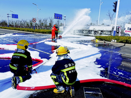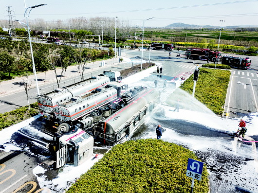 当天中午12点,淮河晨刊记者赶到中环线与解放南路路口看到,这个路口是一个断头路,向东和向南都是不通的。事故现场的解放路北面500米外已经拉起警戒线,许多消防车辆在现场救援,路面上全部是救援泡沫,一辆合肥牌照的油罐车侧翻在路上,消防人员正在对油罐车进行泡沫覆盖,油罐车北侧,两辆油罐车正在使用抽油管转移事故车辆内的汽油。