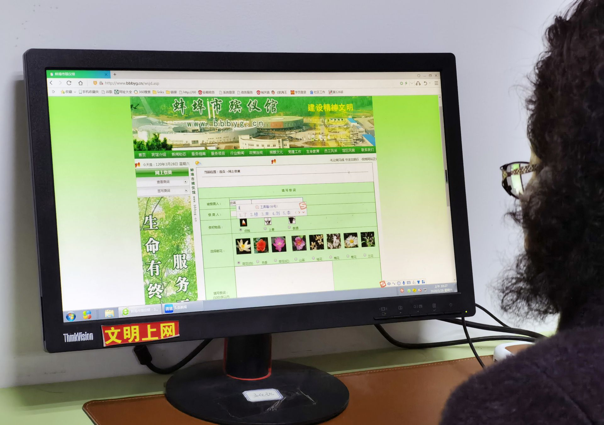 两站社区阅览室,居民魏莉莉使用电脑登录网站进行网上祭祀。
