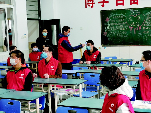 “学生”进入寝室前测量体温。本报讯(记者 靳瑾 文/图)随着高三复课时间日益临近,沉寂了许久的校园又要响起朗朗读书声。重新回到高强度的高三复习之中,学生能否适应?学校防疫措施是否到位,能否保障师生安全?昨天,我市各高中纷纷举行开学演练,查找防疫工作中存在的问题。与此同时,市教育局也组成多个工作组赴各校进行实地督导检查,一手抓疫情防控,一手抓高三教学质量。