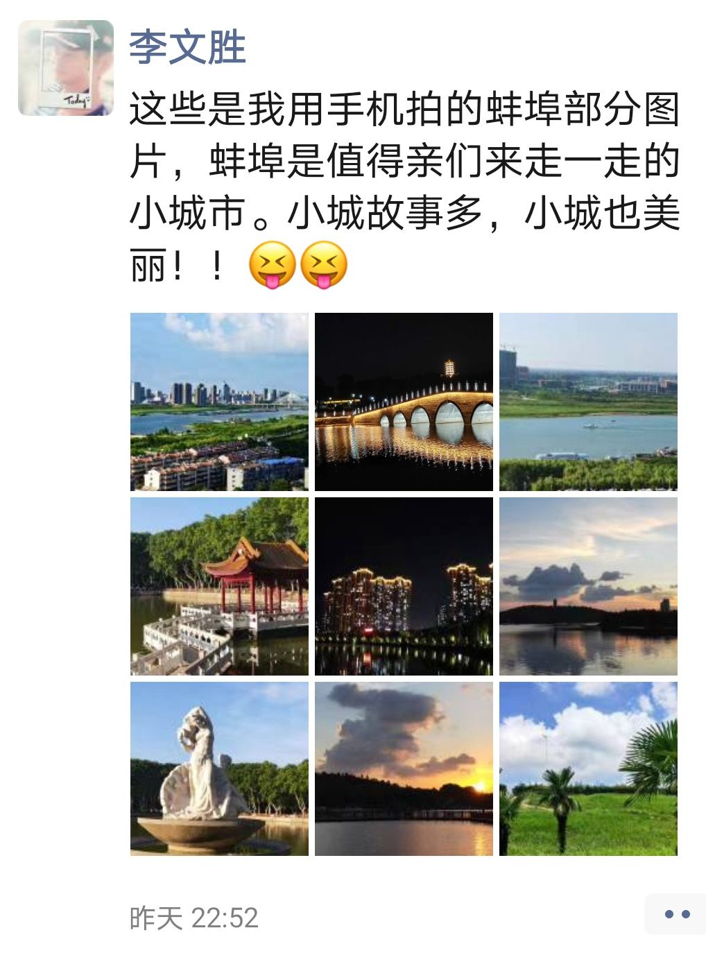 “这些是我用手机拍的蚌埠部分图片,蚌埠是值得亲们来走一走的小城市。小城故事多,小城也美丽!”李文胜最新的朋友圈,发布了九张城市风光图片,里面有淮河风光、张公山风景区、津浦大塘公园等景点,虽然是手机拍摄,但显得很专业。