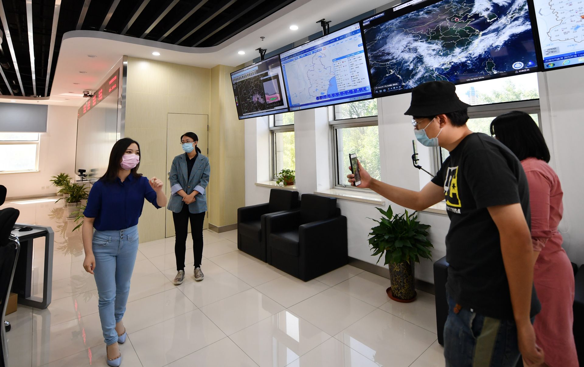 5月12日,天津市气象局的工作人员在气象预报工作区进行手机直播。