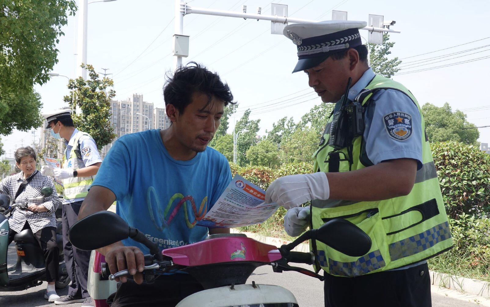 执勤交警坚持劝导提示与执法查纠相结合,督促摩托车、电动自行车骑乘人员规范佩戴安全头盔。