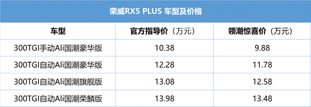 荣威RX5 PLUS共推出4款车型,官方指导价为10.38-13.98万元。与此同时,荣威RX5 PLUS还带来了包含终身免费基础流量、终身免费保养、终身原厂质保在内的3大终身权益,这是行业内首创,将为用户带来全新体验。以及5000元现金礼、荣威车主0首付换购、5000元首付/36期0利率、至高6000元增换购补贴、2000元升级价值5000元国潮荣麟版专享包5大国潮礼遇,领潮惊喜价仅9.88-13.48万元,让用户轻松入手火爆国潮单品。