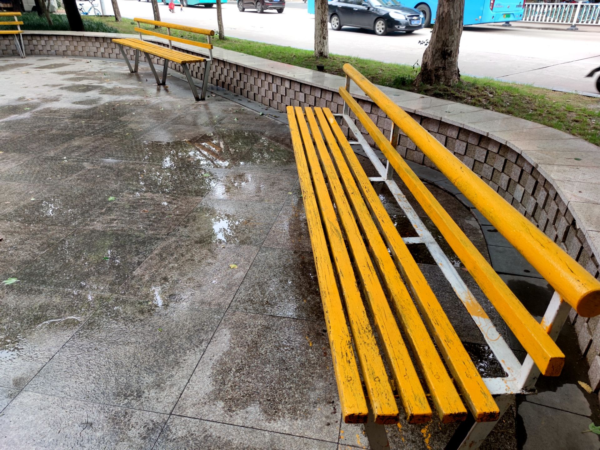 淮河路华运超市中心店斜对面的游园,长椅木板残缺不齐。