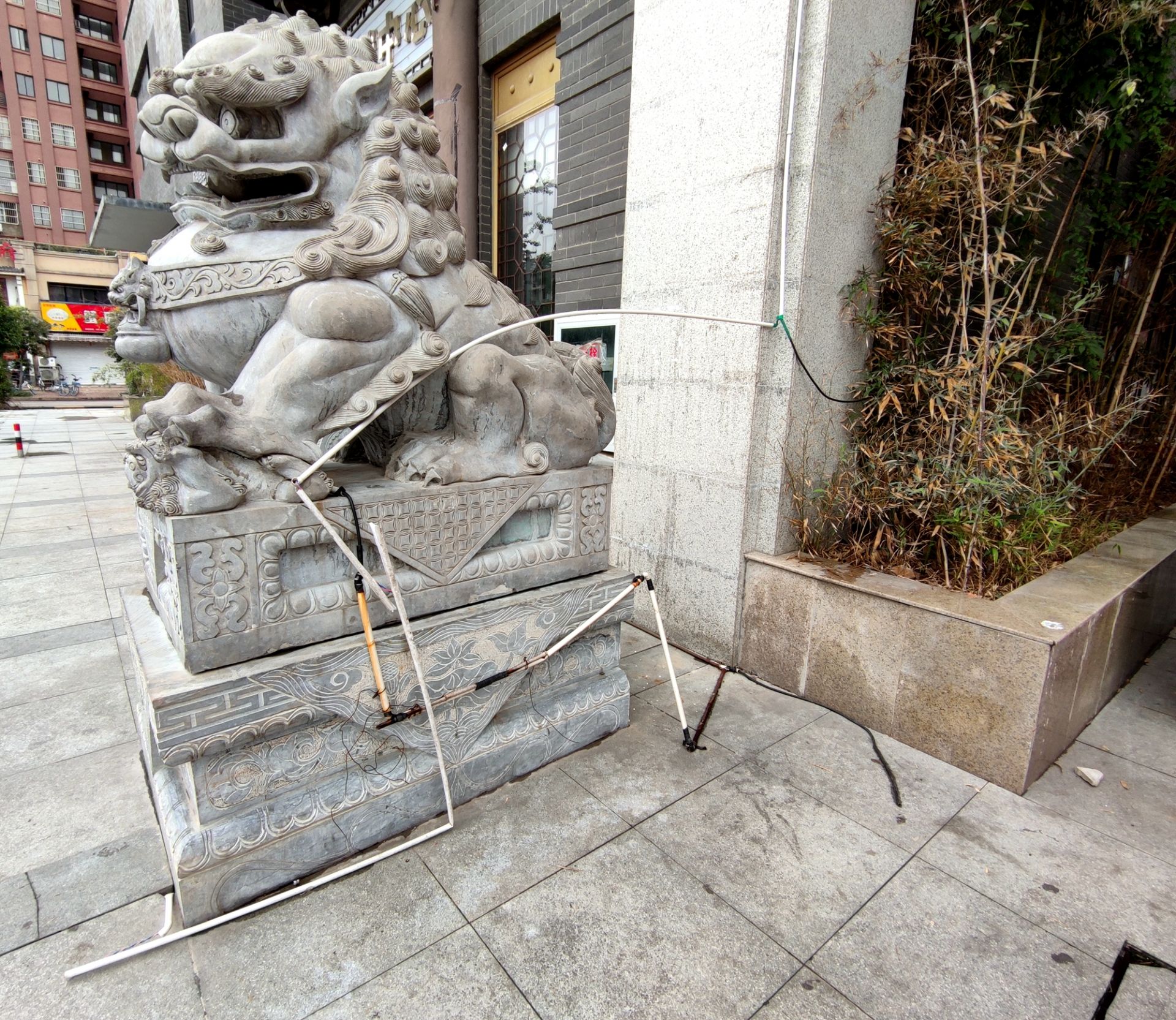 ◤尅街的石狮子身上缠着电线。