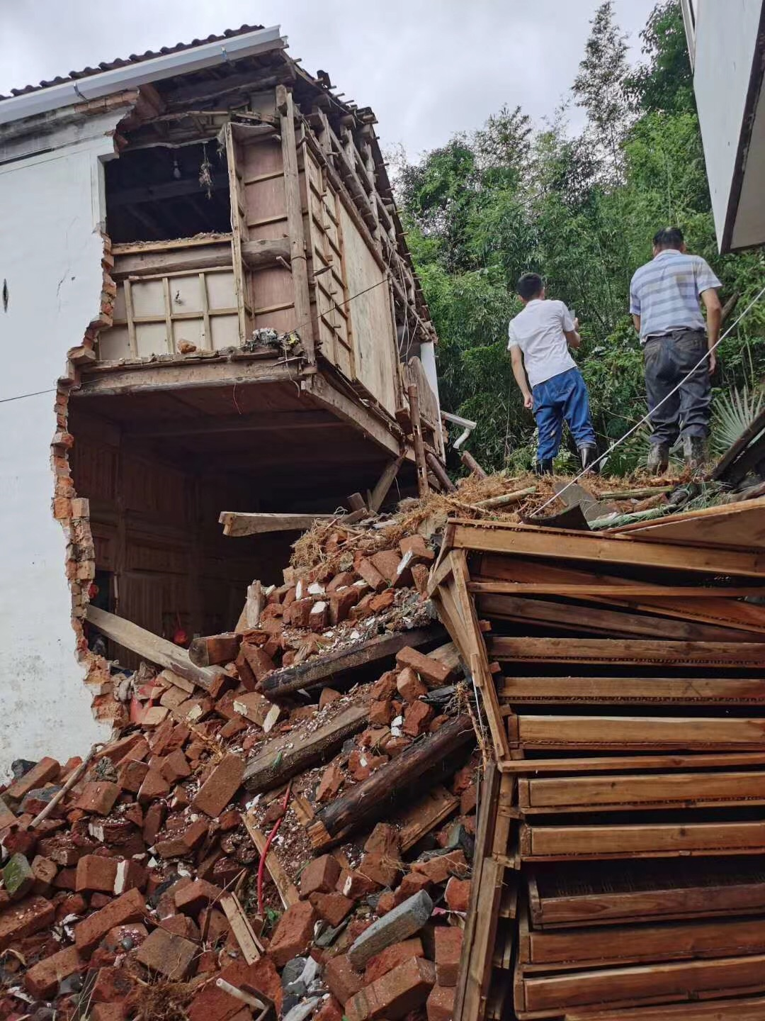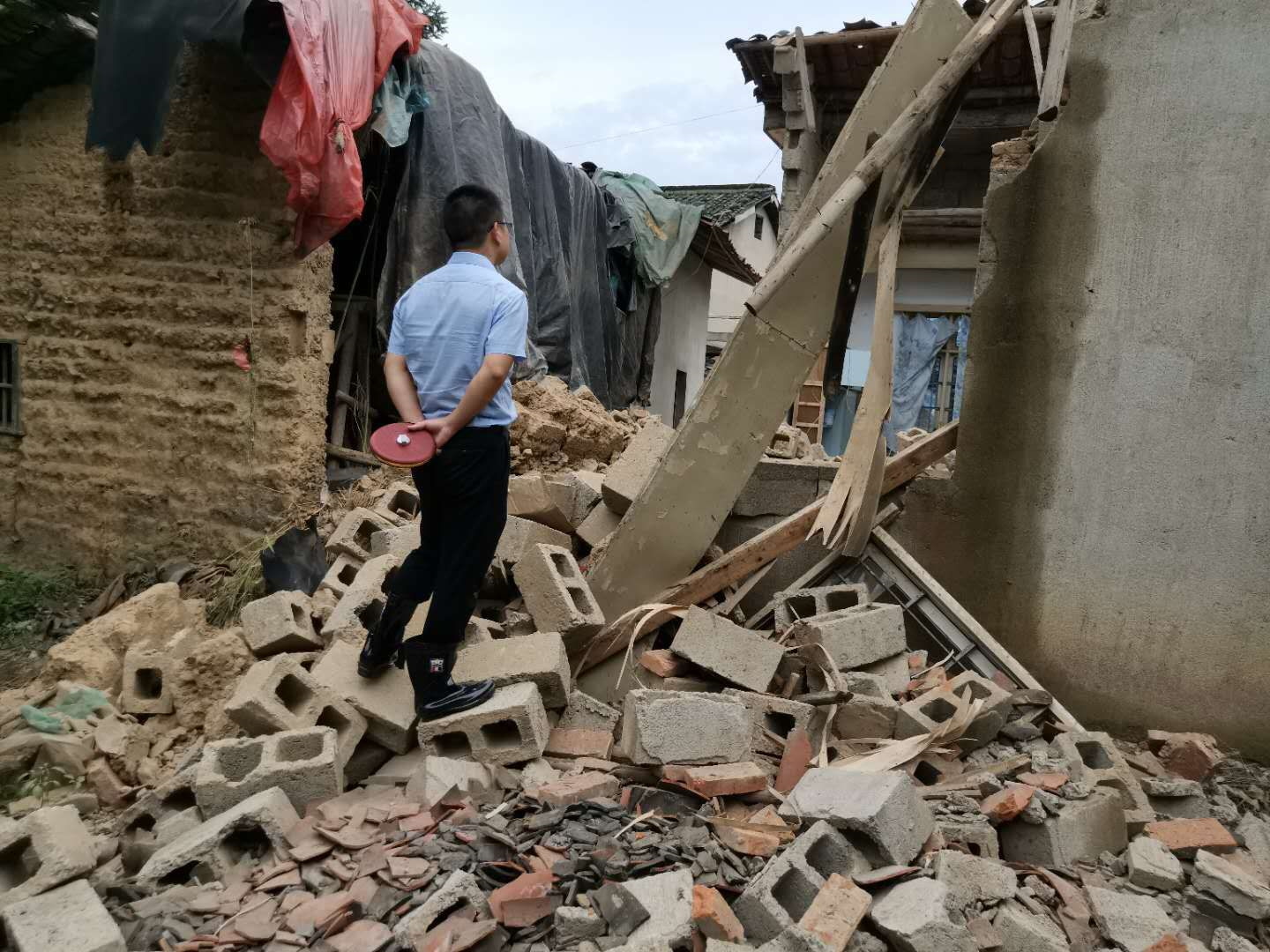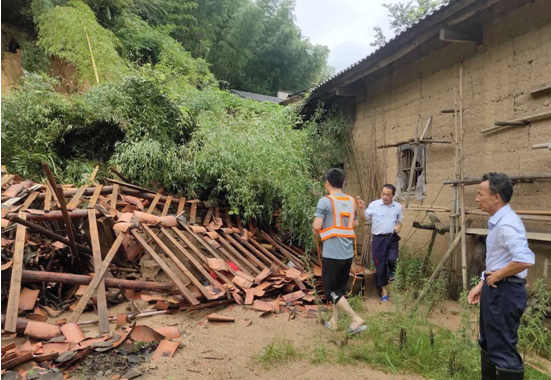 洪水过后,房屋墙体倒塌,受损严重,斑驳的墙面上还留下被洪水浸泡过的痕迹,所到之处,一片狼藉。为快速查勘房屋损失情况,救灾理赔人员不畏艰难险阻,无论是面临房屋倒塌的危险,还是脚下泥泞的土地,都丝毫没有影响他们查勘的脚步。