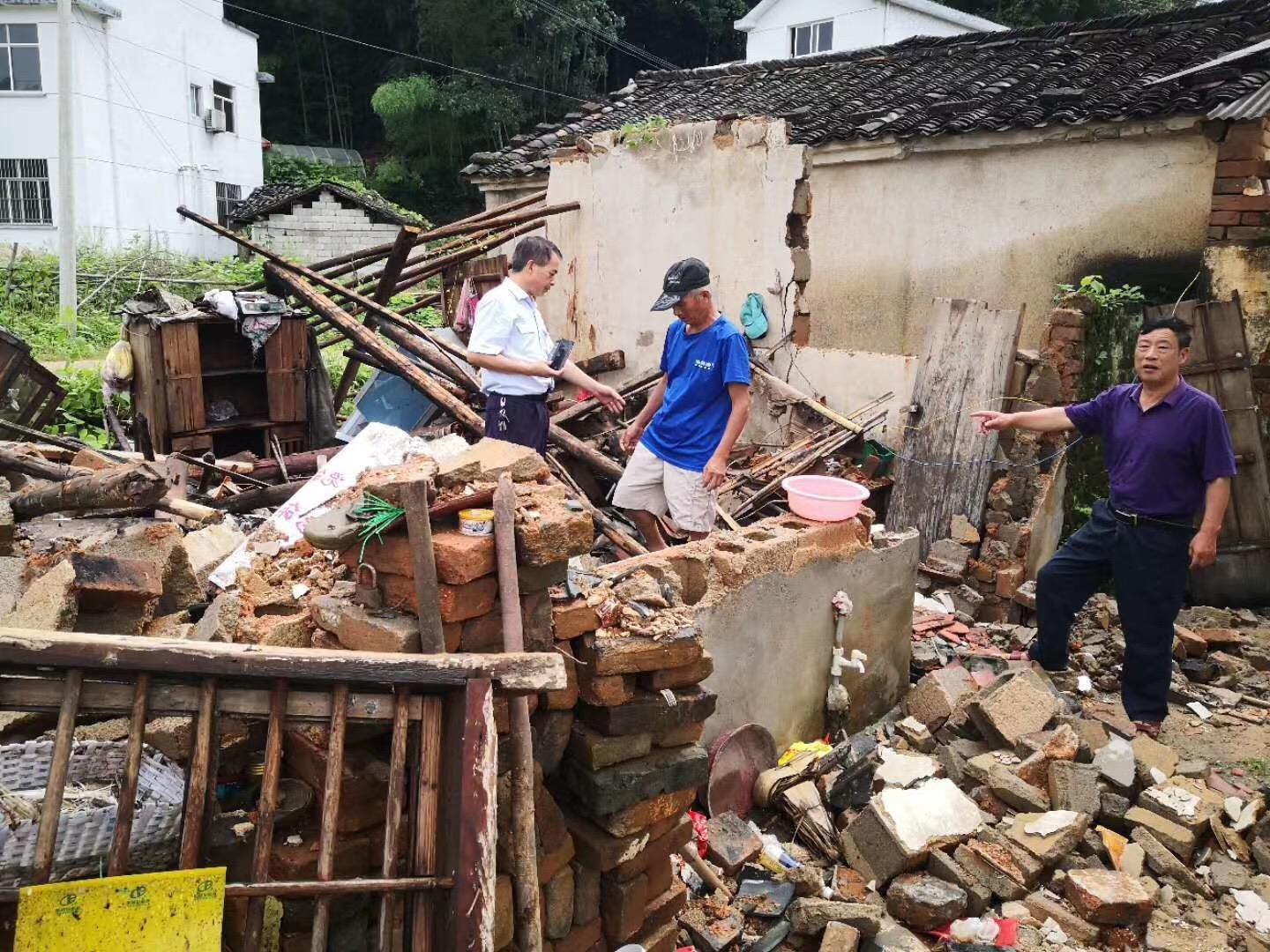 在徽州区伊坑村,救灾理赔人员积极向当地受灾村民讲解农房保险的保障范围和理赔事宜。雨水、汗水湿透了他们衣领,耐心、信心安抚了受灾农户的心。