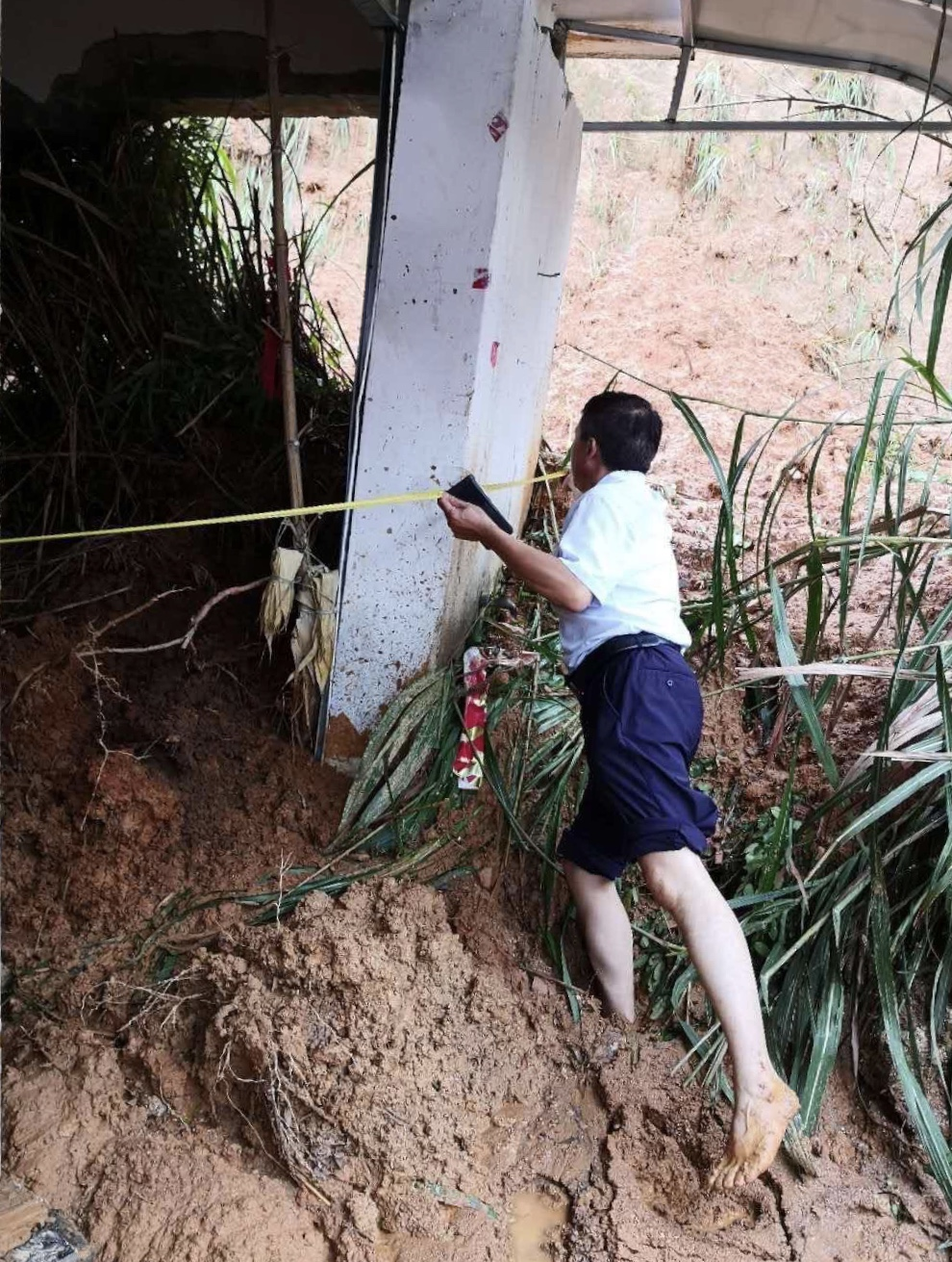 在黄山区新丰乡,50岁的查勘员挽起裤腿、脱掉鞋袜,淌过洪水退却后留下的大面积积水和淤泥,挨家挨户查勘受损房屋。
