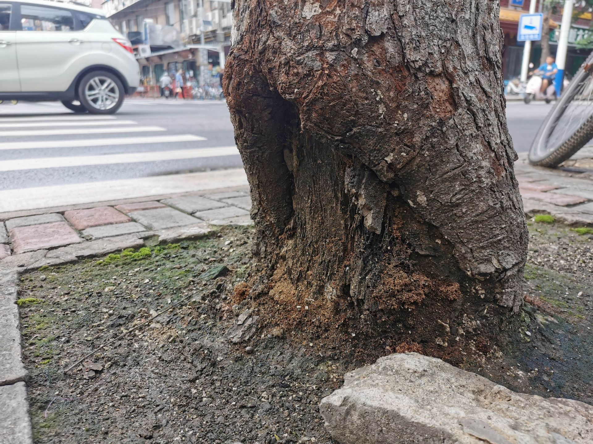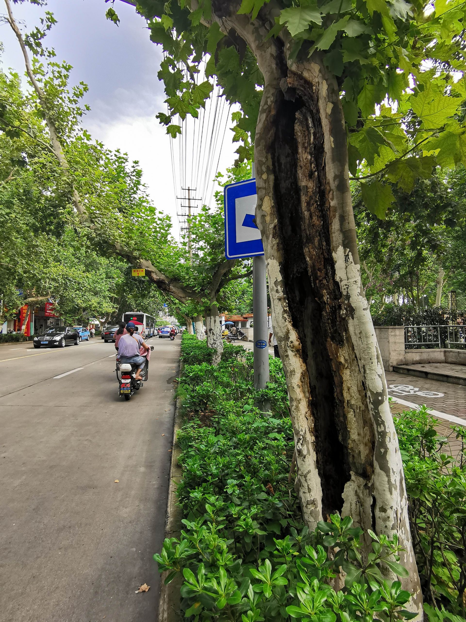 一路上,最让人敬佩的行道树位于延安路津浦大塘附近,一棵树树干几乎全空、靠着树皮活下来的法国梧桐树,看起来已经有很多年了,但仍然枝繁叶茂,被大家称作“树坚强”。
