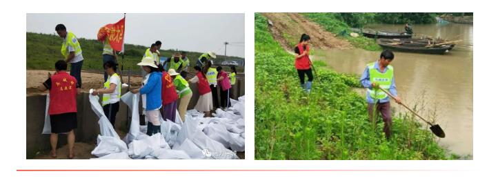 汛情期间,马城镇的田间地头、圩堤上、河塘边多了一群红色的身影。马大嫂巾帼志愿者们积极投身防汛抗灾一线工作中,她们不怕苦不怕累,冒着风雨扛起土袋,表现丝毫不比男同志差。“这下我们可真是名副其实乘风破浪的姐姐了”,马大嫂们边扛着土袋边开着玩笑相互鼓励。运送防汛物资、一线抢险救灾,处处可以看到她们的飒爽英姿,成为马城镇志愿者中一道亮丽的风景线。