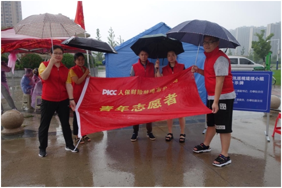 7月26日下午,人保财险蚌埠市分公司团委组织青年志愿者防汛突击队,汇同驻扎在一线防汛工作站的志愿者一起参与抗洪防汛工作。