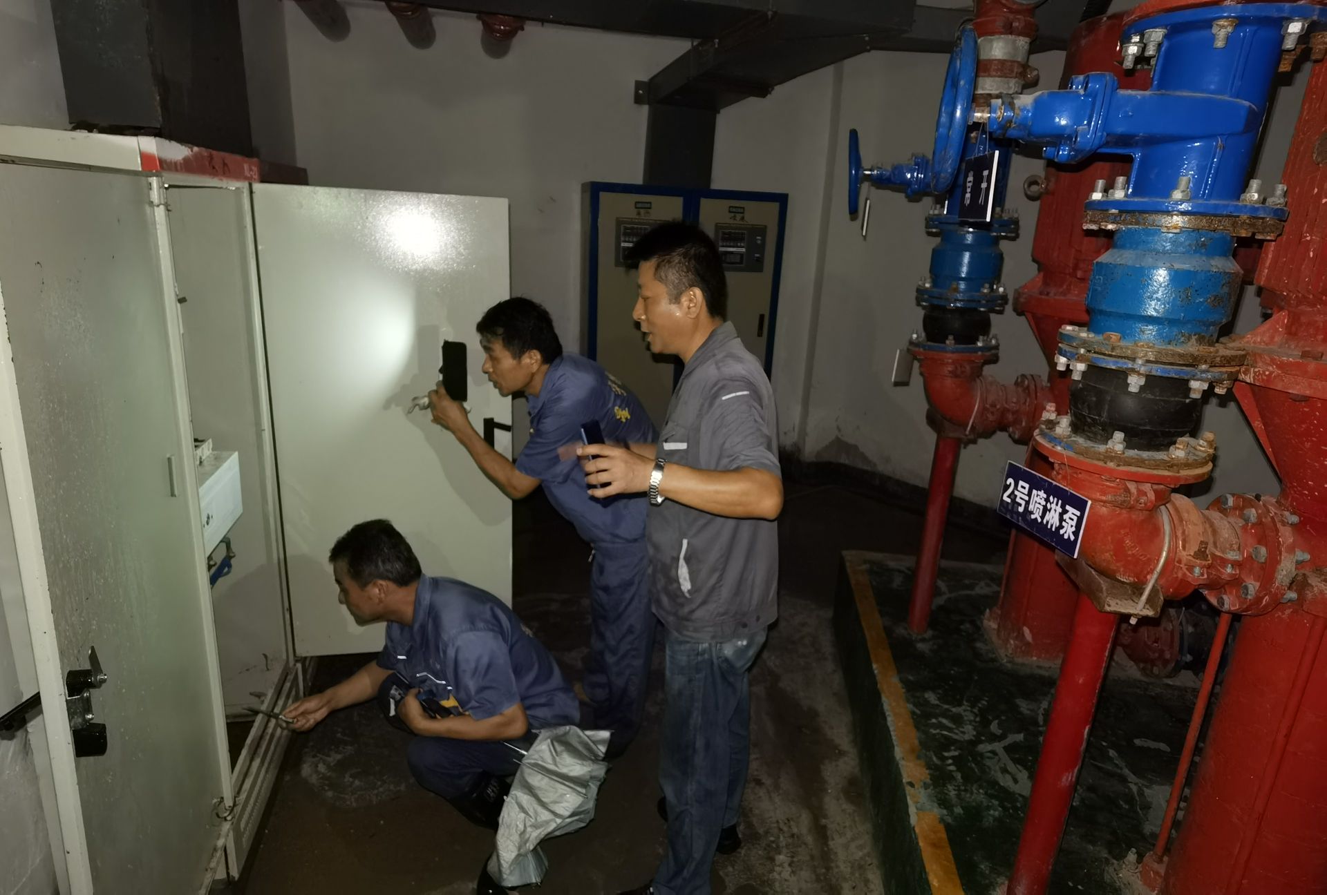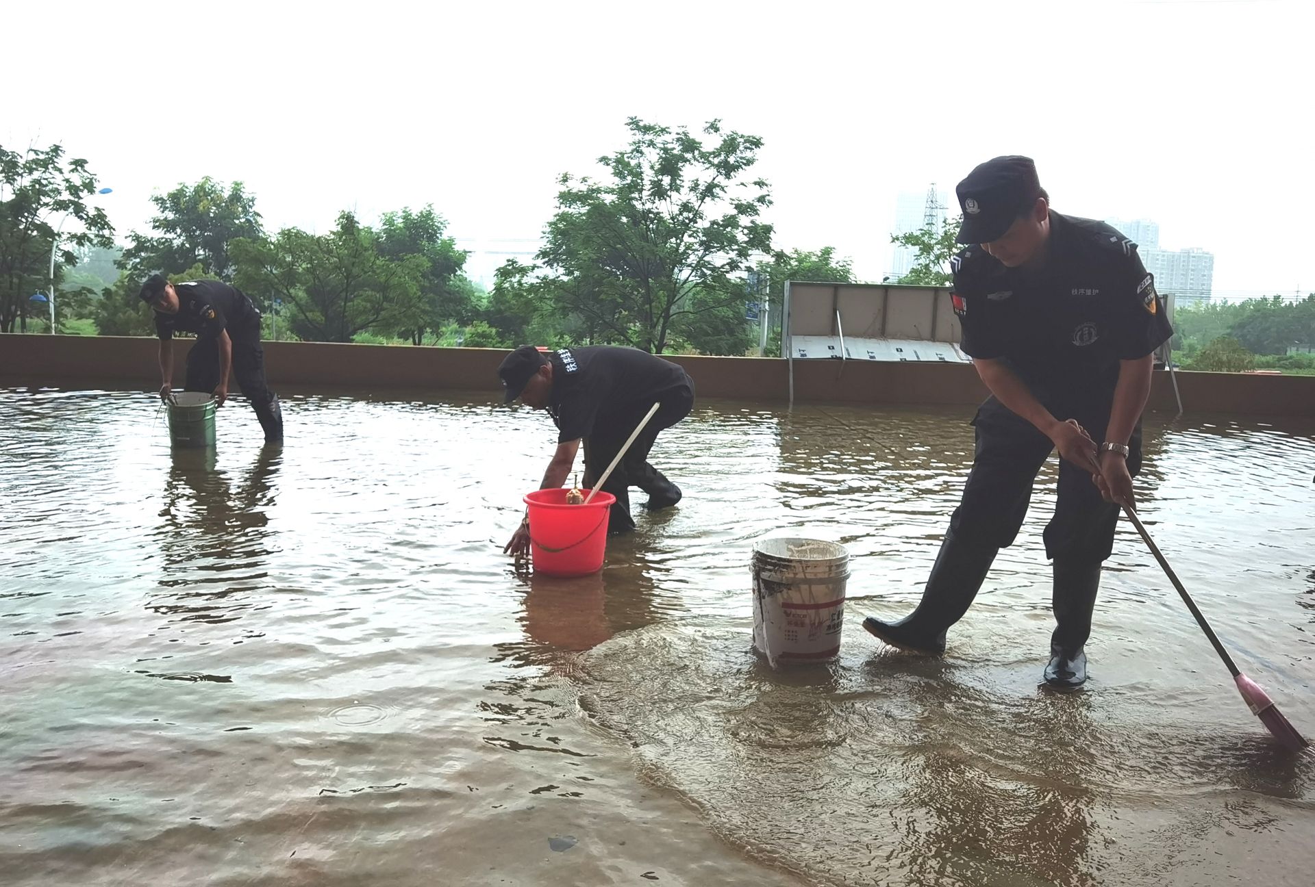 8月9日,康恒•滨湖蓝湾小区,物业保洁、保安及工程人员清理小区积水,勘察漏点。8日夜间我市突降暴雨,市区部分小区出现积水,各物业公司派出人员疏通排漏,保证居民正常生活。蚌埠日报全媒体记者 刘晨