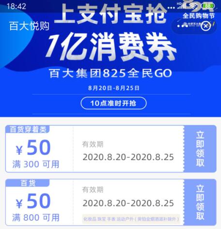 8月20日10点起,连续六天,支付宝将联合合肥百大集团,在安徽省范围内发放1亿元消费券。
