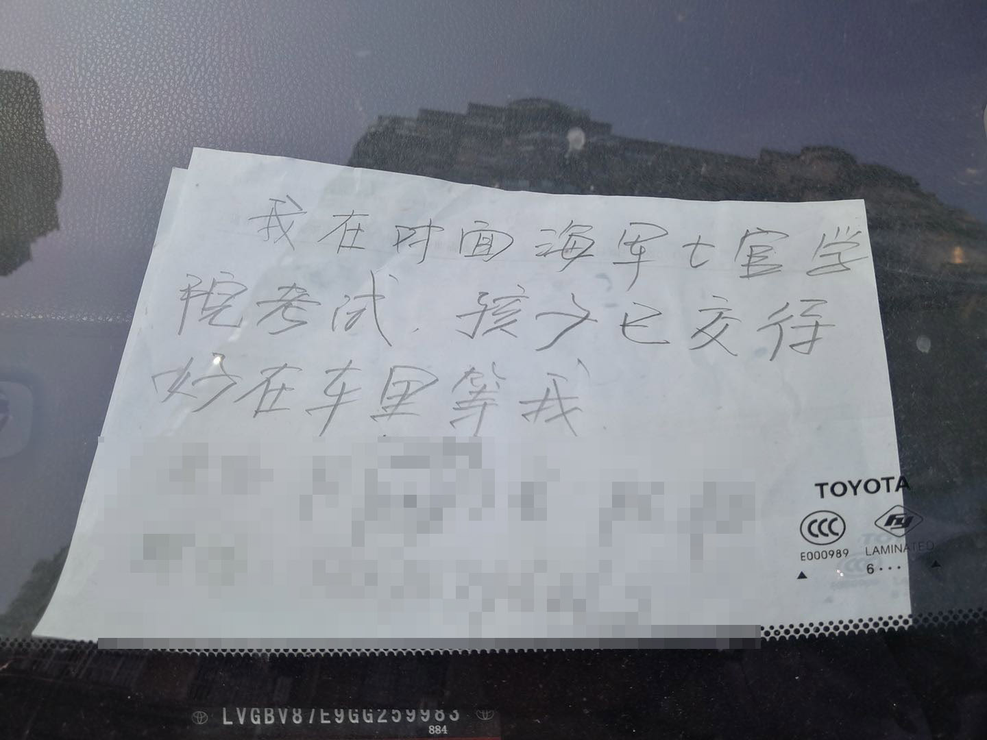 民警在车里找到小女孩妈妈留的一张字条,上面写着:“我在对面海军士官学校考试,孩子已交代好在车里等我。”并留有她的联系电话。民警等到小女孩意识逐渐清醒后,给这位妈妈发了一条告知短信并在字条背面留下派出所信息,随后将小女孩带回派出所。