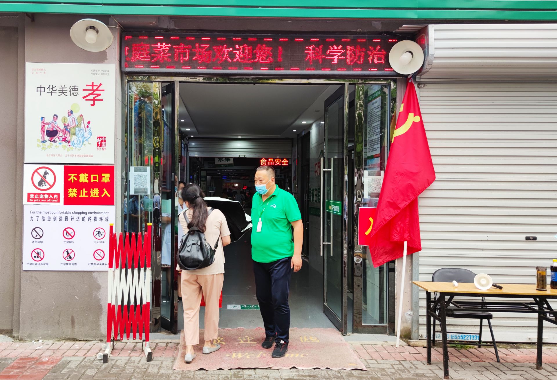 农贸市场门口,引导员劝导前来购物的市民佩戴口罩。