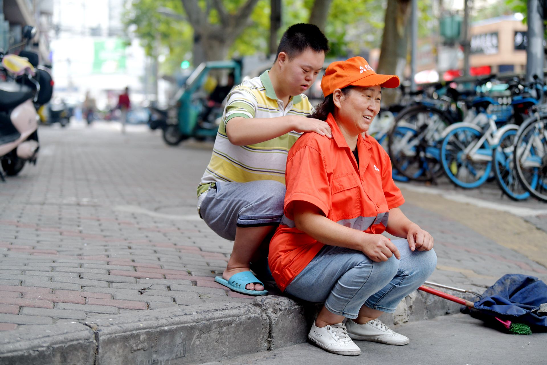 在中荣街北段,人们经常能看到一名环卫保洁员带着儿子上班,孩子经常帮助妈妈清扫路面,休息时为妈妈捏肩砸背缓解疲劳。这个孩子名叫大富,今年16岁了,虽然身患唐氏综合征,但是个懂事的孩子,他的一举一动让身边的人很感动。
