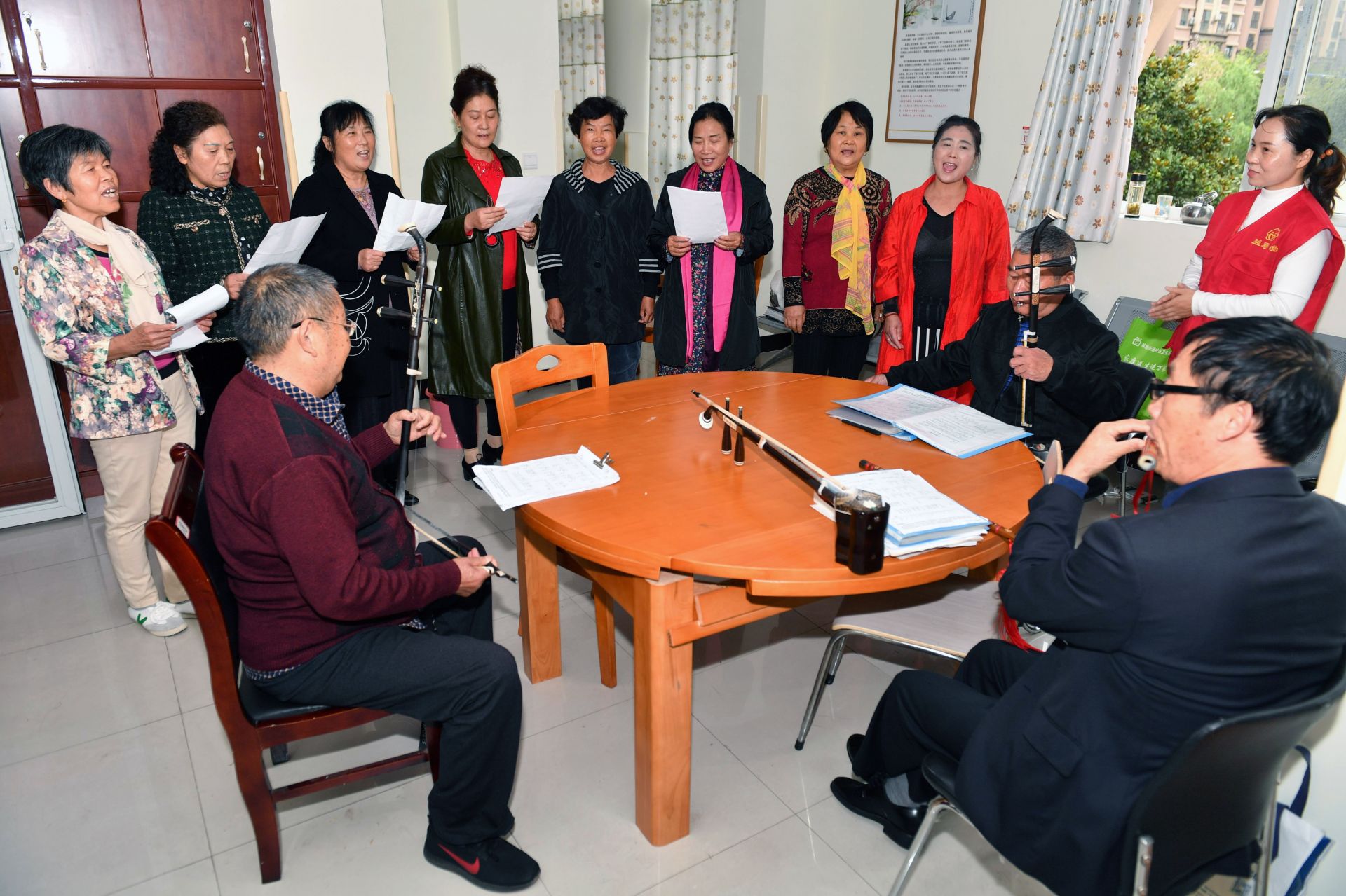 老人们在养老机构提供的活动场所内学习器乐。