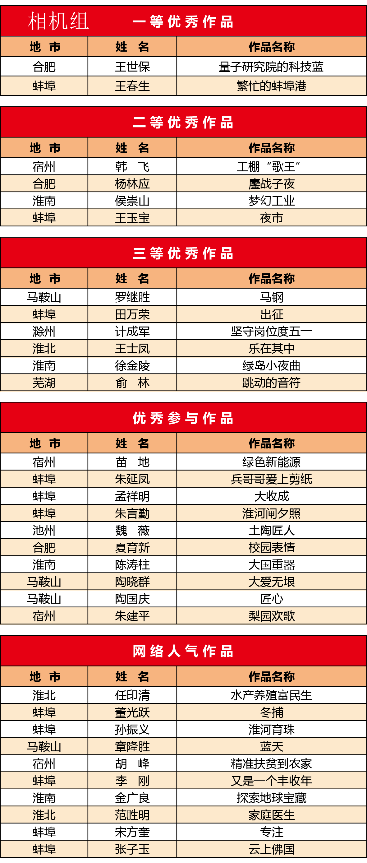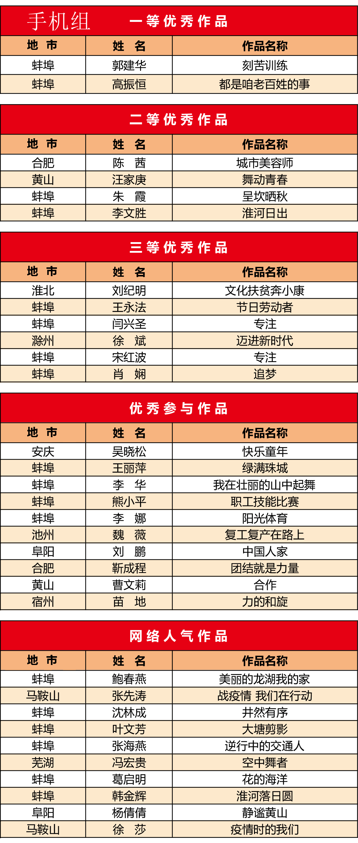 根据网络得票数和专家现场评审,最终相机组、手机组各评出一等优秀作品2件、二等优秀作品4件、三等优秀作品6件、优秀参与作品10件和网络人气作品10件。近日,获奖结果揭晓,我市多人获奖,其中相机组中:王春生《繁忙的蚌埠港》获得一等奖、王玉宝《夜市》获得二等奖、田万荣《出征》获得三等奖;手机组中:郭建华《刻苦训练》和高振恒《都是咱老百姓的事》获得一等奖、朱霞《呈坎晒秋》和李文胜《淮河日出》获得二等奖、王永法《节日劳动者》和闫兴圣《专注》等获得三等奖。