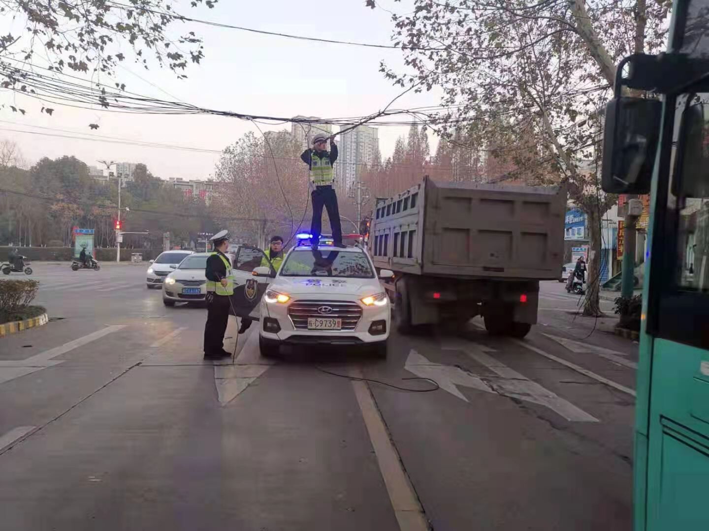 “早上7点5分,刚出小区不久就发现路堵的不行,原来前面一辆大客车被电缆线卡住动不了,为了缓解高峰期交通堵塞,执勤交警不得已站在警车上处理电缆事故。必须点个赞,人民警察辛苦啦!”12月22日一大早,市民发了一条朋友圈,配了这段文字以及9张图片。图片中,一名交警站在警车上用树枝托举着电线。