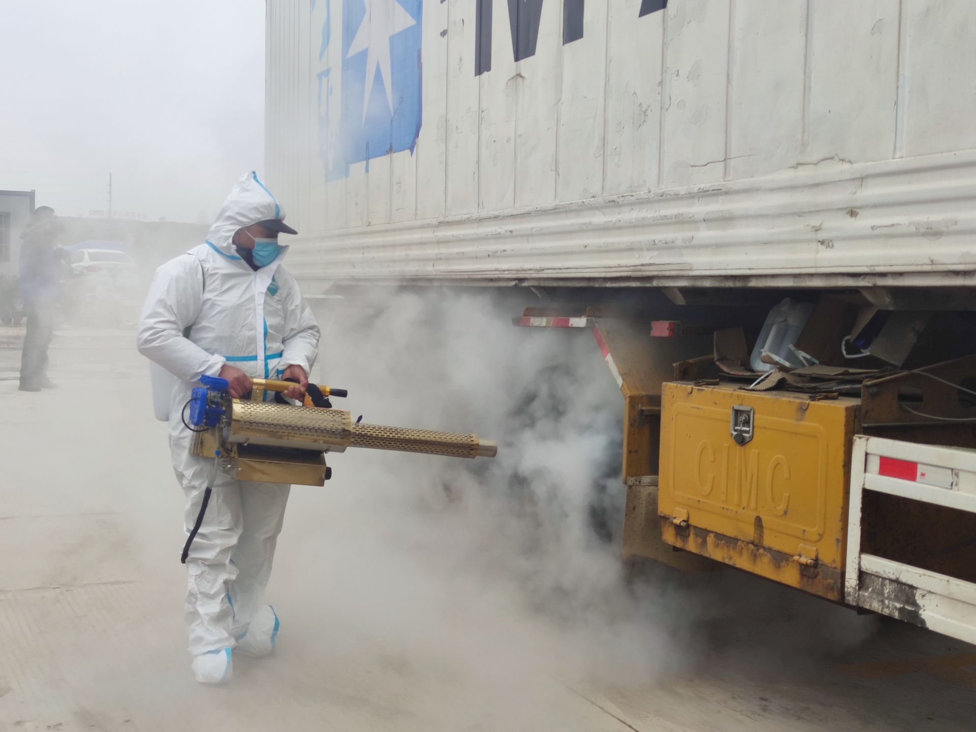 工作人员正在对车辆外部进行消杀。
