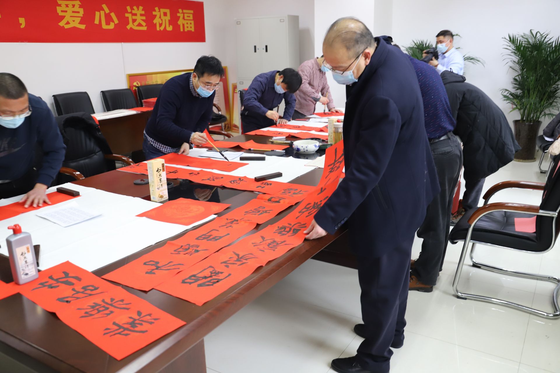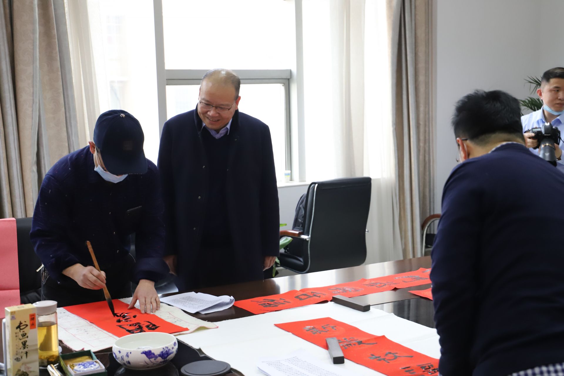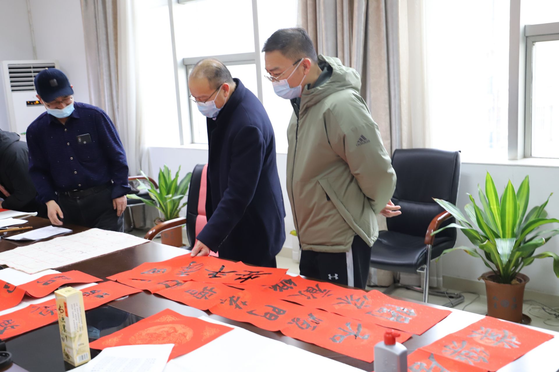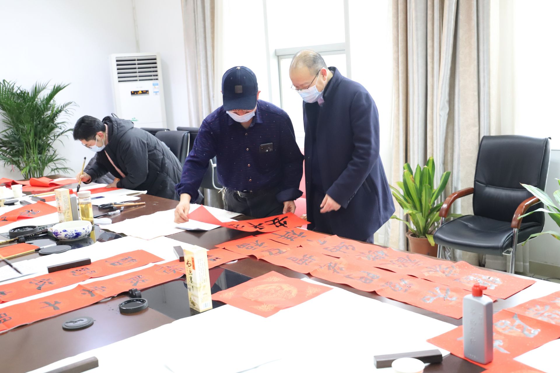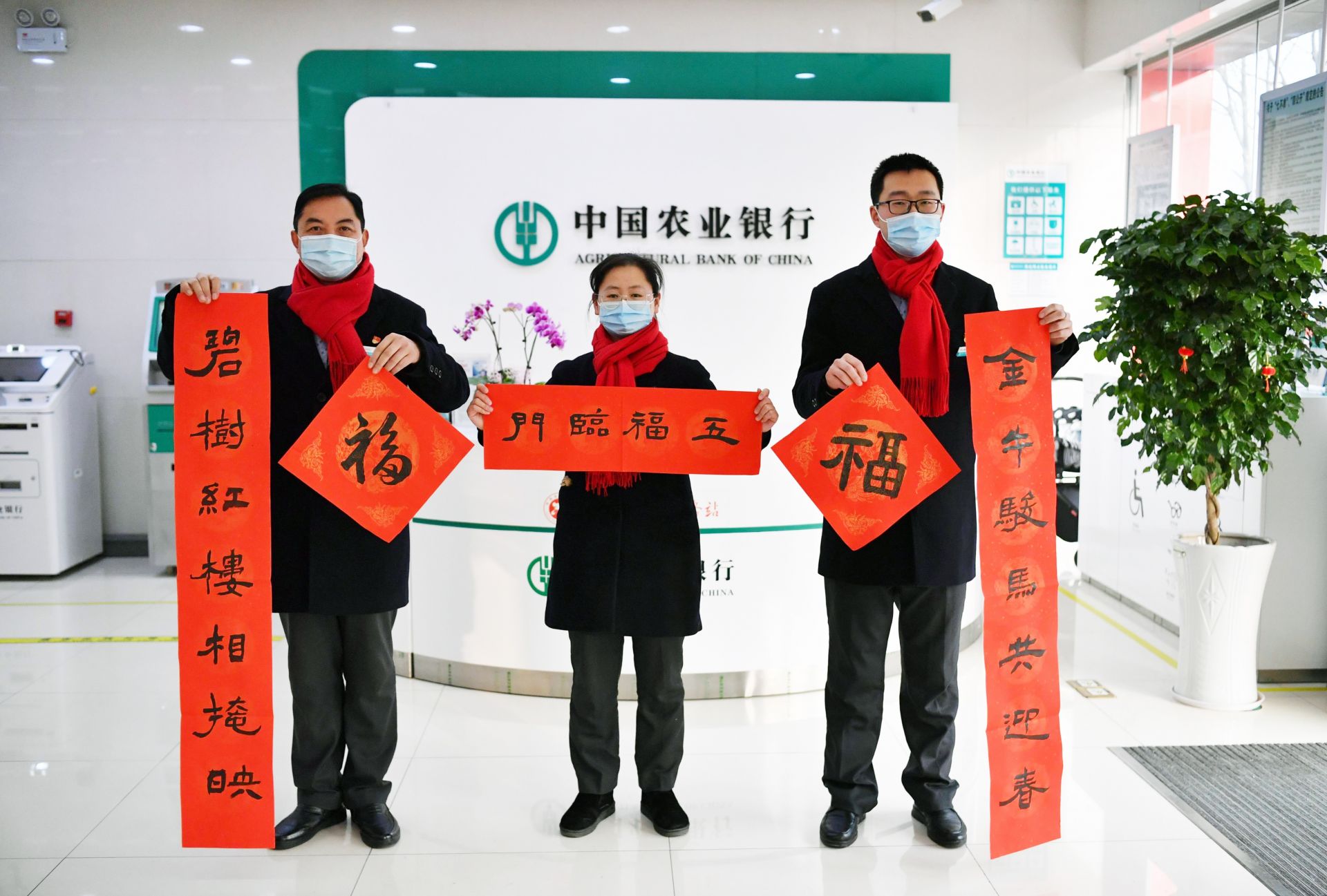 1月24日下午,市书法家协会部分书法家在中国农业银行蚌埠分行会议室挥毫泼墨,为脱贫户书写春联(中国农业银行蚌埠分行员工展示书法家为脱贫户书写的春联)。当日,该分行与市书法家协会联合举办写春联活动,此次活动所写春联将于近期送到脱贫户手中。