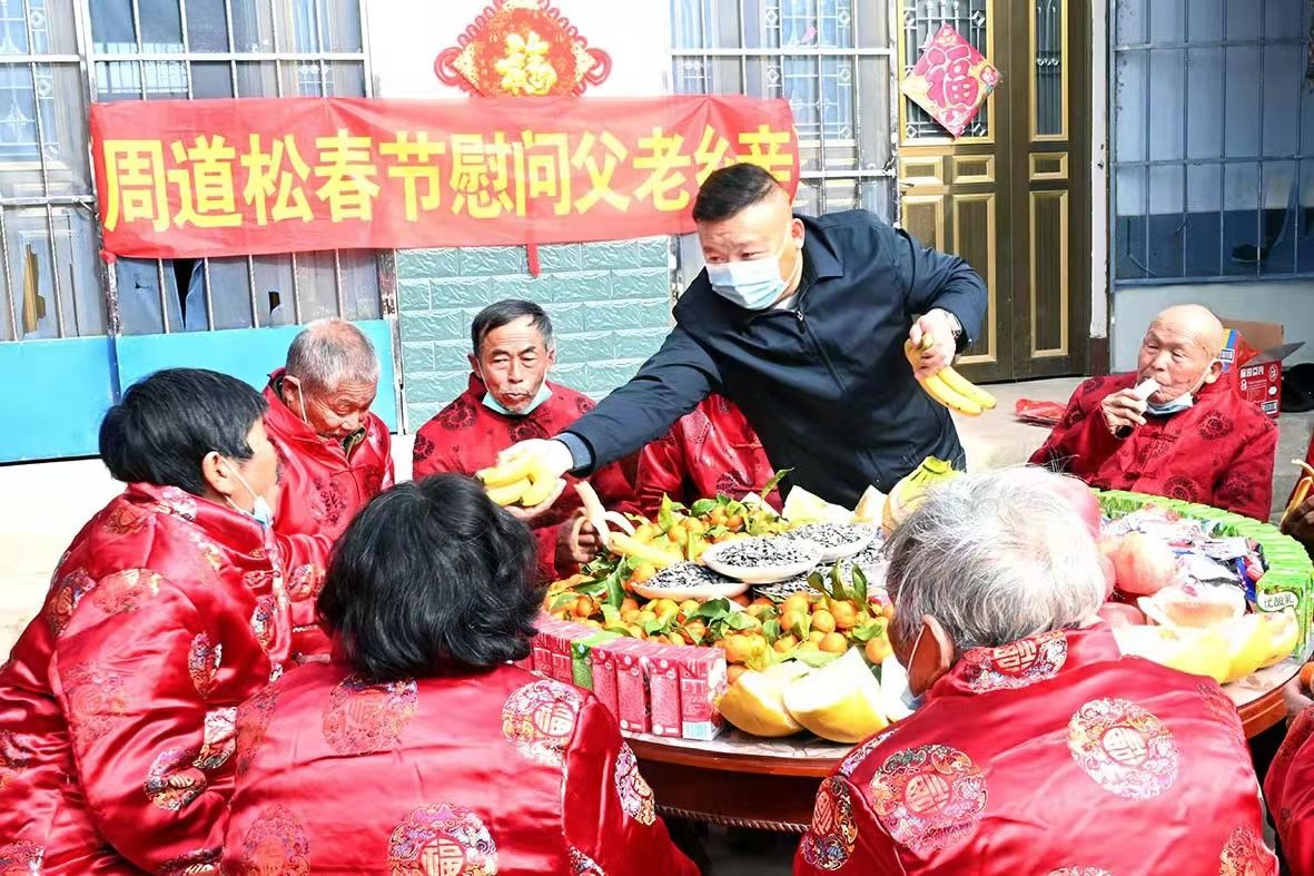 憨厚淳朴的青年农民周道松致富后, 始终不忘生养自己的土地和乡亲, 多年来持续关心家乡贫困群众,投身扶贫济困,长年资助困难老人。2012年起每年端午、中秋、春节3个中华民族传统节日, 他都要返乡慰问五保户、孤寡和残疾老人。给他们送去现金及米.面.油.肉、洗漱用品等,还给他们理发、洗脚,聊家常, 用自己的真心去点燃老人寂寞孤单的心, 让他们感受到暖暖的爱意, 安祥地过好晚年生活!他不仅关心本村老人, 还帮扶邻近集北和三义两村5位老人的生活。有几年盛夏时节,他还购买西瓜、葡萄等时令水果送给镇养老院里的老人消暑。
