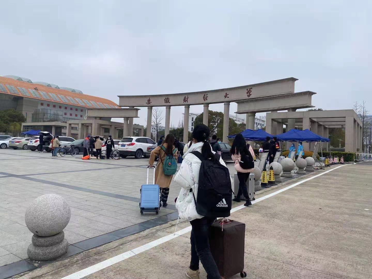 3月6日上午,安徽财经大学东校区,返校的大学生们拖着行李箱有序地向学校大门走去。 当日,该校迎来首批返校大学生。按照疫情防控的需要 , 学校实行分批次有序开学,校医院早上7点至晚上9点对返校大学生进行测温、流调、应急处理等工作。按计划,本周六为大一、大二学生返校日,周日为大三学生返校日,毕业班学生暂不返校。 蚌埠日报全媒体记者 陈春怡