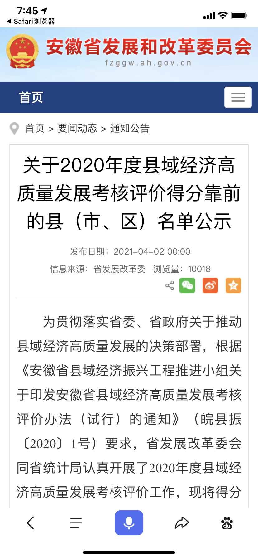 公示指出,为贯彻落实安徽省委、省政府关于推动县域经济高质量发展的决策部署,根据《安徽省县域经济振兴工程推进小组关于印发安徽省县域经济高质量发展考核评价办法(试行)的通知》要求,省发展改革委会同省统计局认真开展了2020年度县域经济高质量发展考核评价工作,现将得分靠前的县(市、区)予以公示。蚌埠日报全媒体记者 杨露露