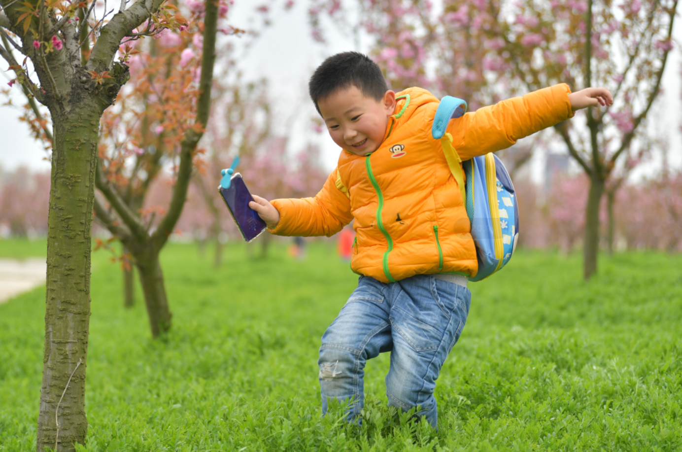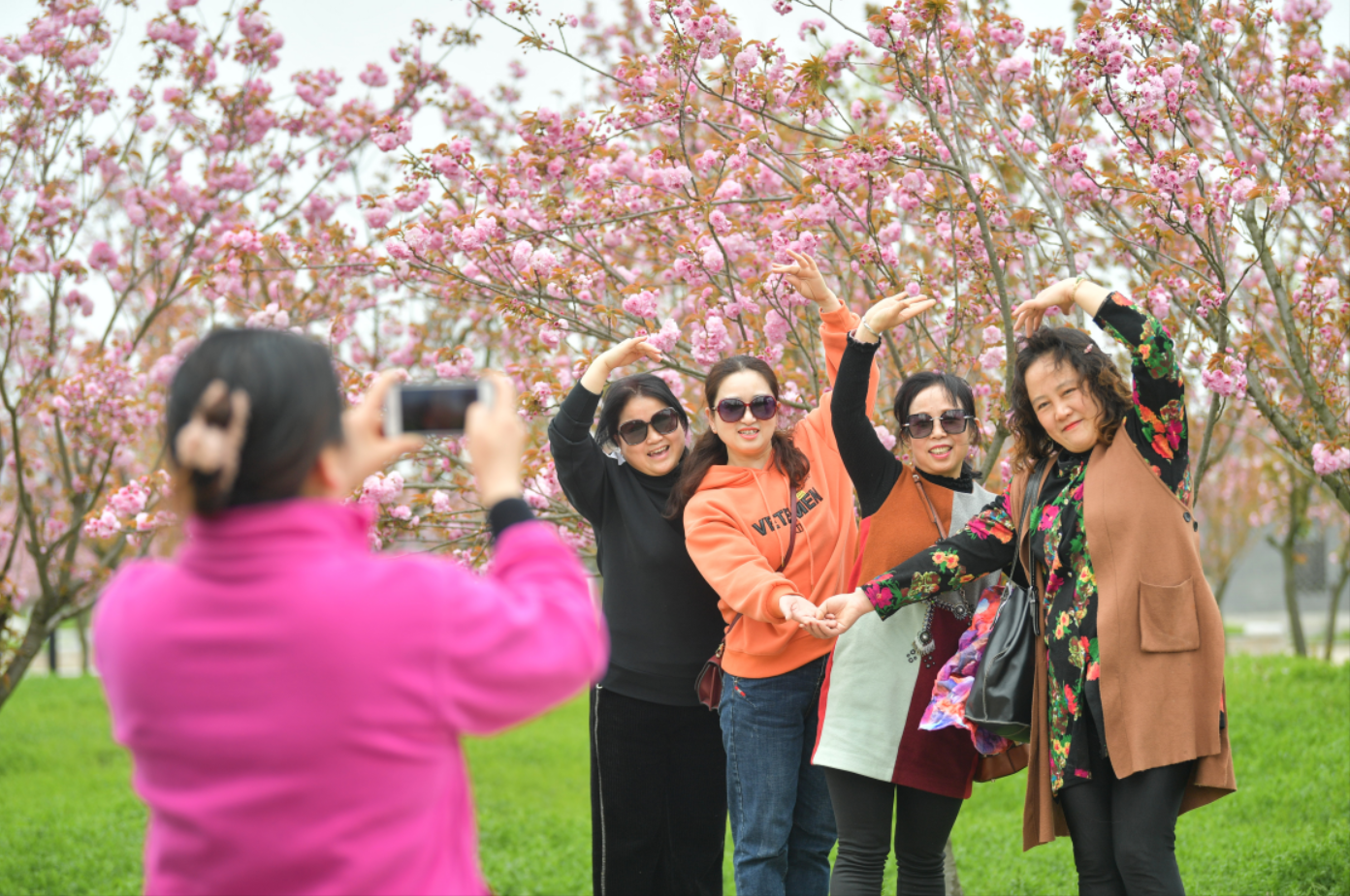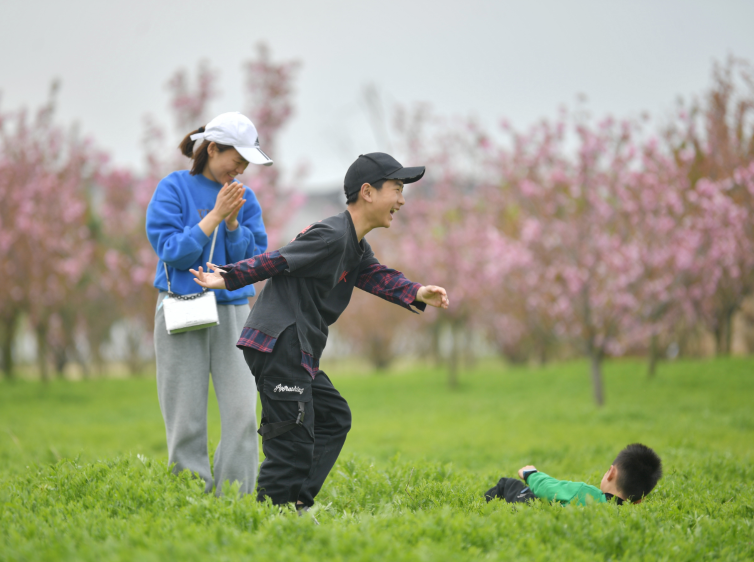 4月5日上午,固镇县南城区谷阳城遗址公园内,游人在樱花树下嬉戏游玩合影。当天,固镇“樱花艺术文化节”在此开幕,公园里47个品种、15万株樱花迎风开放,吸引众多游人流连忘返。蚌埠日报全媒体记者 陈昂