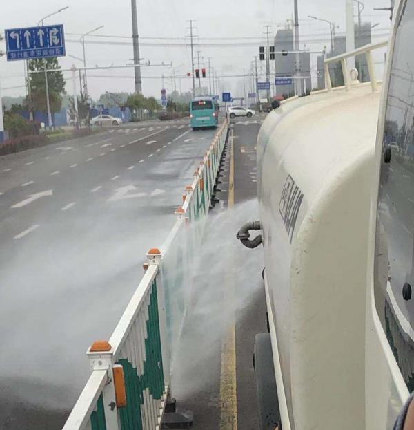 洒水车在龙华路对路面和隔离栏杆进行冲洗。