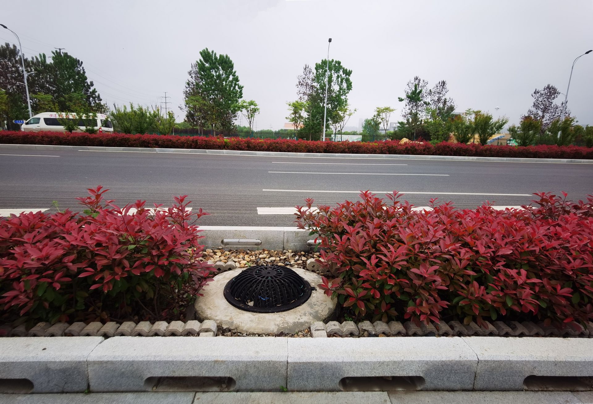 学苑路(曹山路至汤和路段)道路两侧分绿带设置为下沉凹式低床绿地,间隔设置溢流雨水口,周边用镂空侧石圈围。