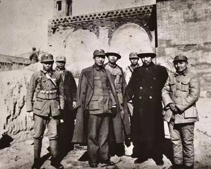 1937年,在太原八路军驻晋办事处,程朝先与首长合影(前排左起程朝先、彭雪枫、周恩来、邓小平,后排中张震)。