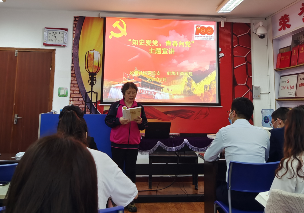 现场参加活动的有蚌埠工商学院老师们和09届与10届的党团学生代表,社区党总支还邀请了“五老”宣讲团代表马长侠老师和有四十年党龄的社区退休老党员吴季阿姨,用“典型带学”的力量,请她们用自已入党的新身经历,面对面给当代青年人上一堂生动的党史教育课。
