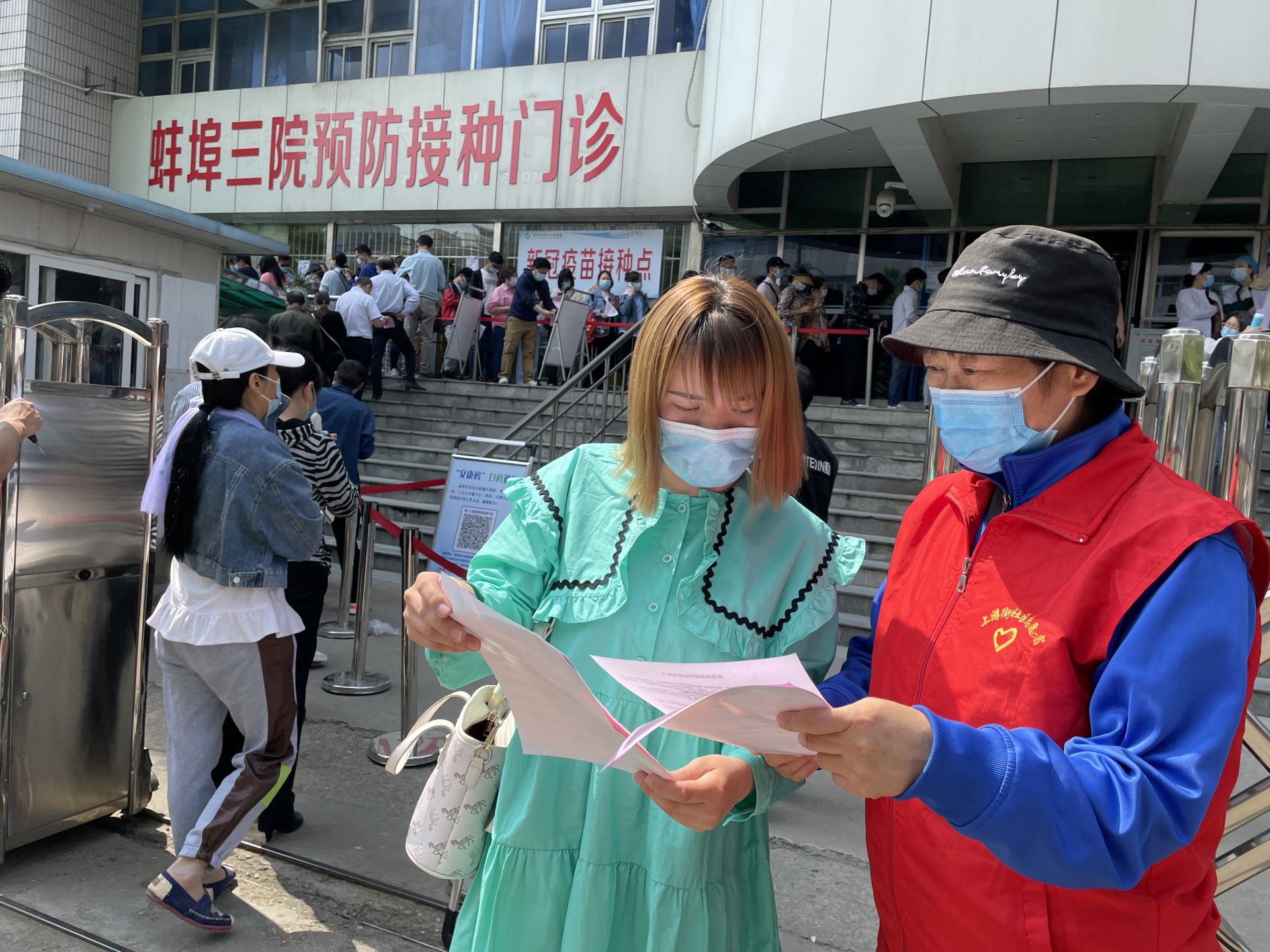“大家排好队,戴好口罩、保持距离,提前准备好身份证,不要插队……”5月18日上午9点半,在蚌山区宏业村的新冠疫苗临时接种点,前来接种疫苗的队伍长达几十米,民警郝永明在队伍前来回走动,在维持现场秩序同时,还不忘提醒市民。