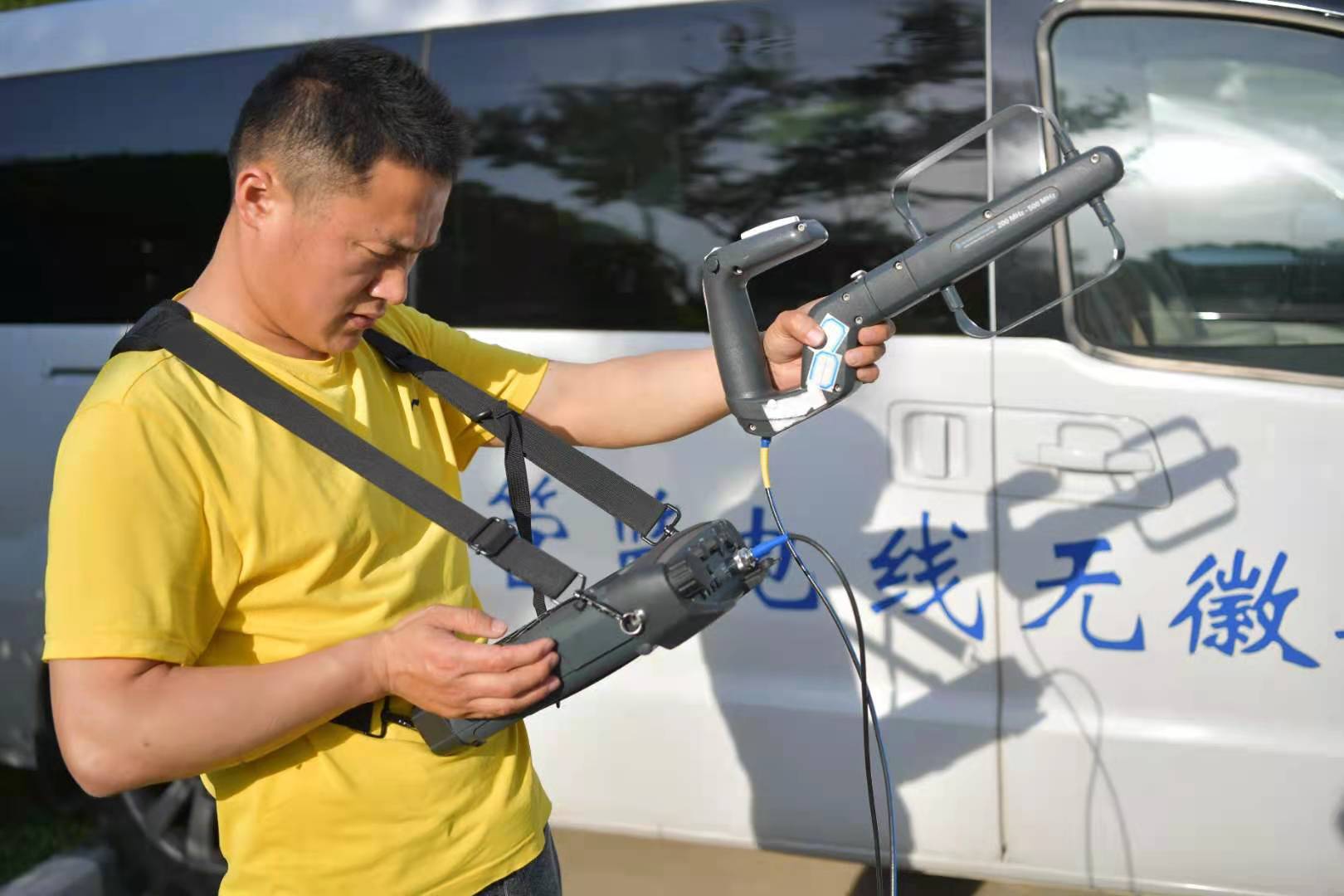 市无线电管理处工作人员使用便携式监测设备对非法信号进行测向定位。