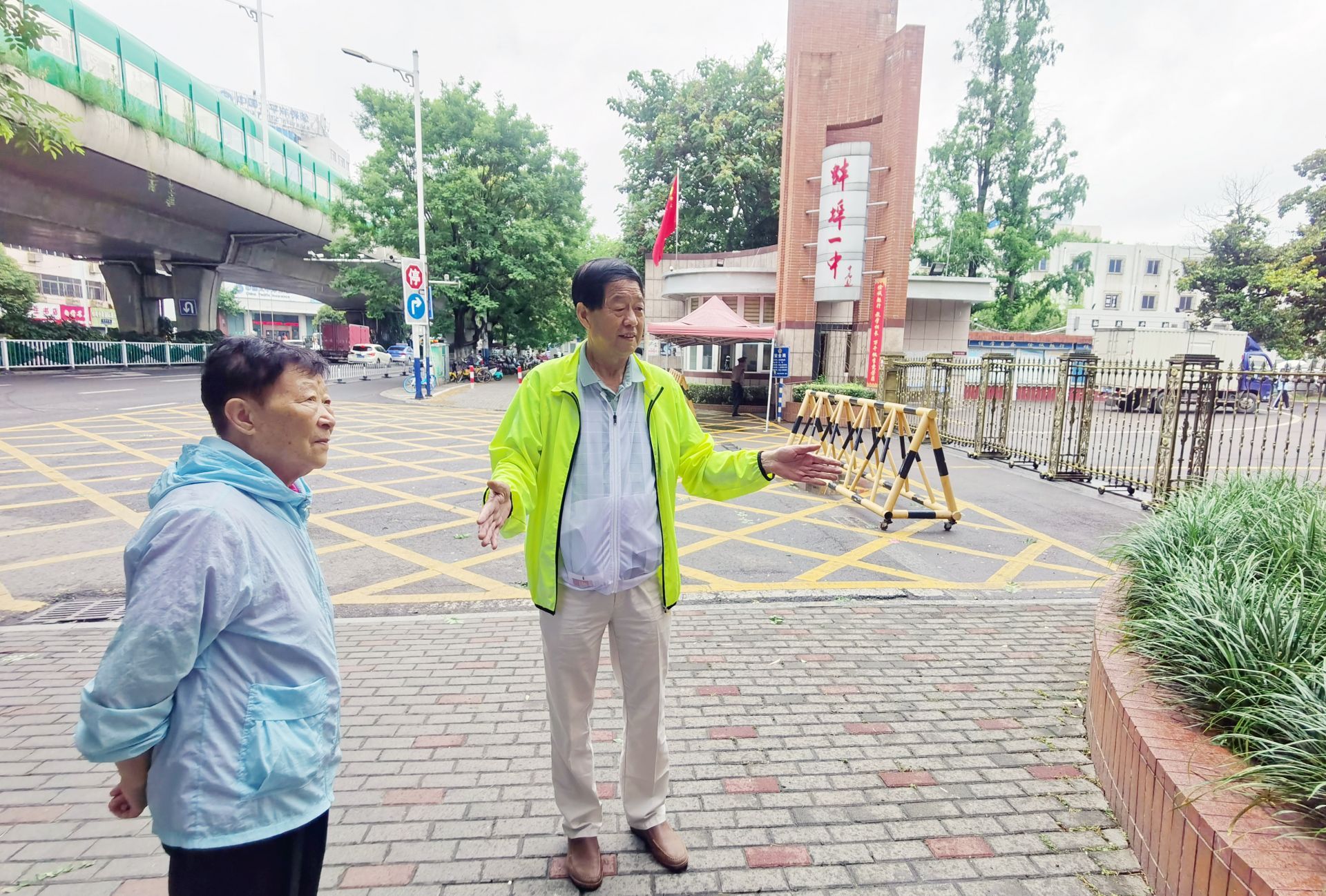 6月3日,一中校门口,“爱心奶奶团”成员钮金龙和团长孙守珍查看现场,商量爱心助力高考活动准备事宜。