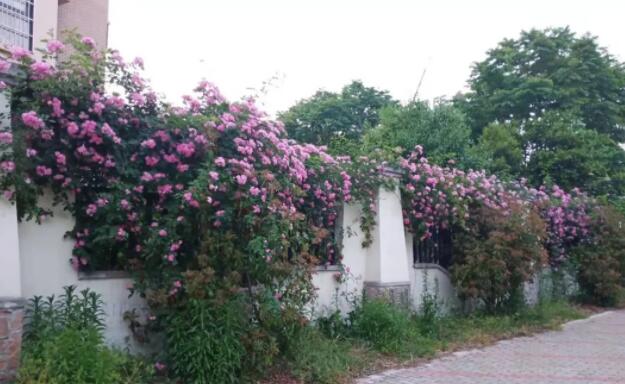 镂空铁艺围墙上,满墙蔷薇花开。