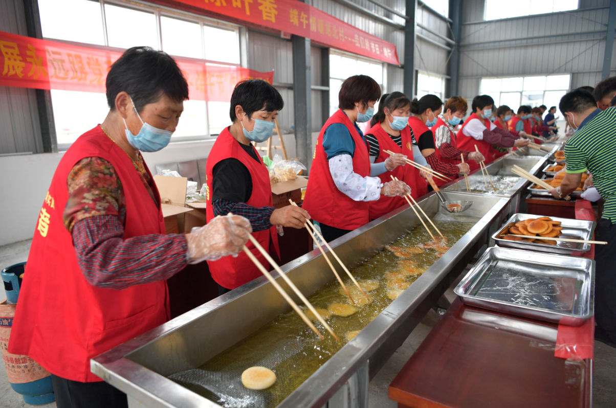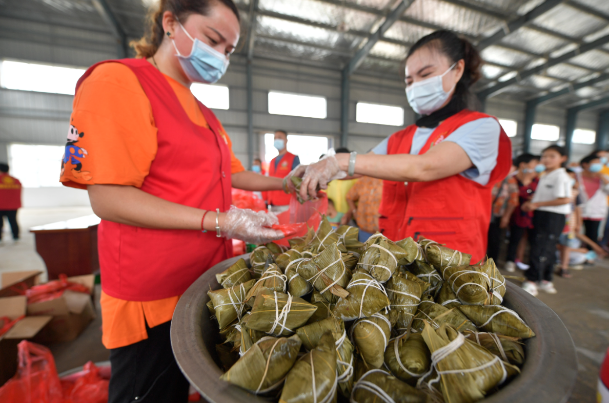 志愿者们来到现场后便开始忙活起来,炸油条的炸油条,炸糖糕的炸糖糕,包粽子的包粽子,打包的打包,保证每家每户都能领取到,一个上午发放了500多份慰问品。