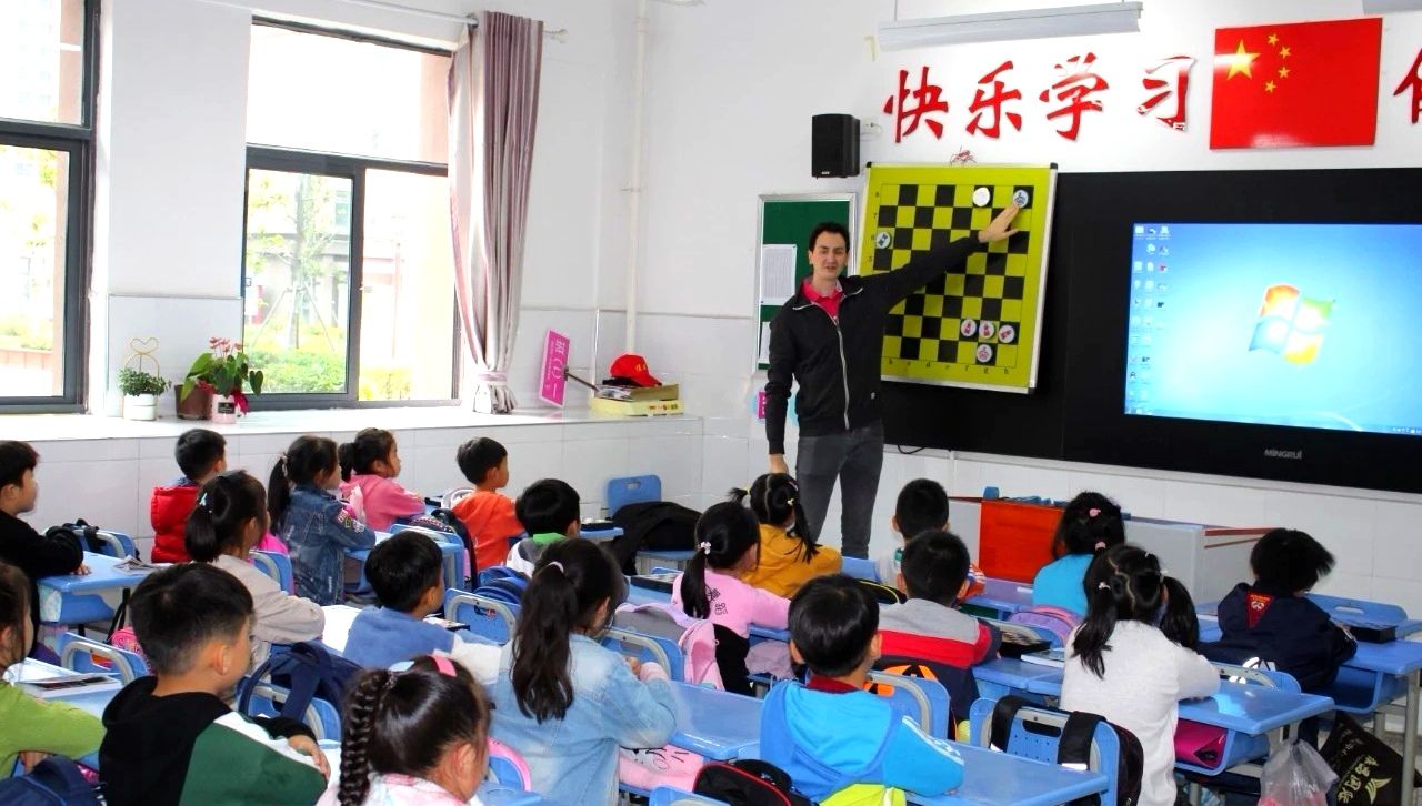帕斯卡于2019年10月来蚌,走进我市部分学校及幼儿园开展国际象棋公益活动。(受访者供图)
