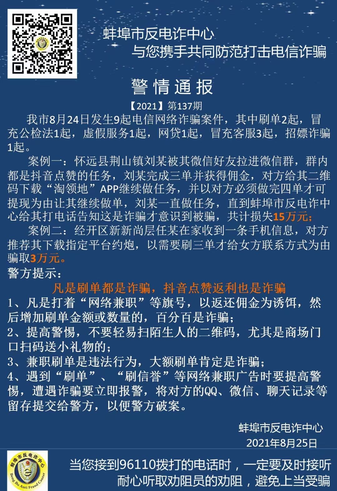 8月25日,市反电诈中心发布今年第137期警情通报,显示8月24日我市共发生9起电信网络诈骗案,并公布两起典型案例。其中,怀远县荆山镇一居民因参与抖音点赞任务被骗15万元。警方提醒:凡是刷单都是诈骗,抖音点赞返利也是诈骗,请广大市民提高警惕,切勿上当受骗。 全媒体记者 贾铁成