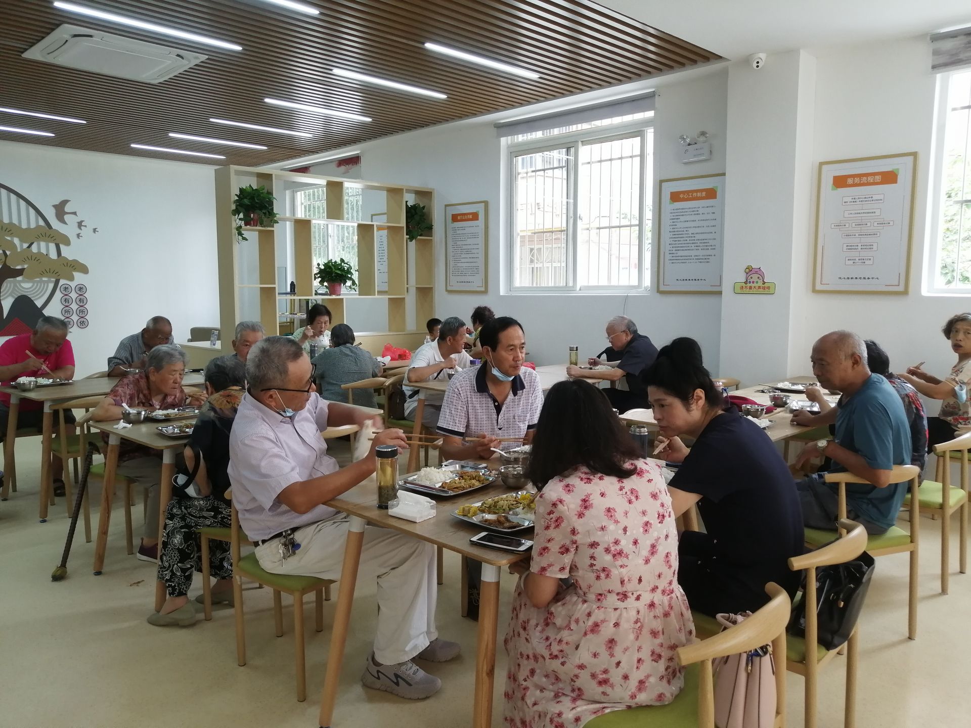 当天中午,记者来到该中心实地探访,只见一层助餐食堂干净整洁,墙上展示板张贴着价格和当日食谱,盛饭区的工作人员则戴着口罩做餐前准备。时间一到,家住附近的老年人或领着餐盒,或拿着餐盘在窗口前刷卡消费,现场显得有条不紊、井然有序。不一会儿,整个食堂就坐满了人。