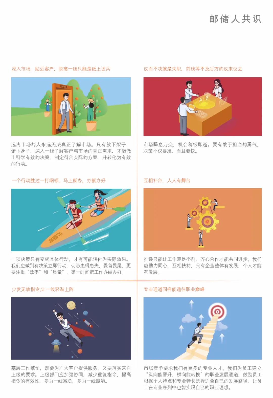 值得关注的是,半年报提及的10条“邮储人共识”,提倡简洁高效、务实有为、团结协作,甚至都已在业内引发共鸣。例如,“发简明的文,开有用的会,说简洁直白的话”“职务不等于权威,创造价值才会被尊重”“深入市场,贴近客户,脱离一线只能是纸上谈兵”“一个行动胜过一打纲领,马上就办,办就办好”“少发无效指令,让一线轻装上阵”……