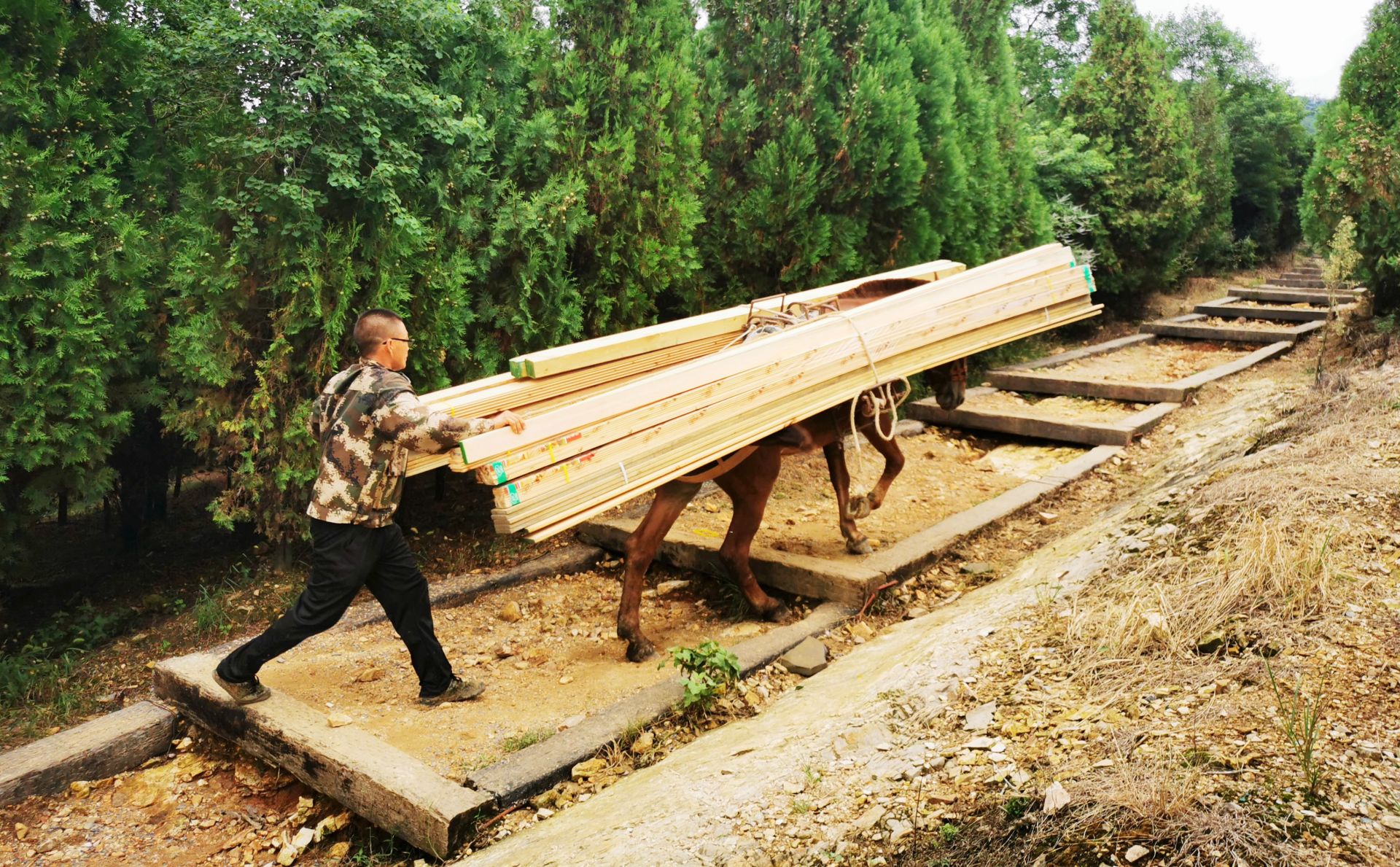 平台西侧上山道路,是涂山登山步道。虽然负重四五百斤,但骡子并不吃力,轻松向山上爬去,李应锋跟在后面,扶着木料掌握平衡,一路小跑,遇到特殊情况,会喊上一嗓子让骡子慢一点,骡子很聪明,能根据人的各种声音做出不同反应。