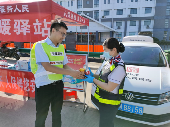 10月1日,在安徽淮南南高速路口温暖驿站,该站点搭建在淮南市公安局交警支队高速一大队院内。当天天气晴,因为是国庆长假第一天,许多车辆出行,事故车较多。工作人员一方面积极、快速地处理事故,拍摄事故车照片、告知理赔流程;另一方面给予客户力所能及的帮助,提供送水、送食物、客户车辆检测等服务。工作人员在处理完一起事故车辆后,观察到车主玻璃有污渍,主动为车辆添加玻璃水,从微小的细节彰显人保的暖心服务。客户竖起大拇指点赞说:“我们一路奔波,车玻璃脏了也没当回事,你们竟然主动帮我们添加玻璃水,人保服务超出我们预期的满意!”
