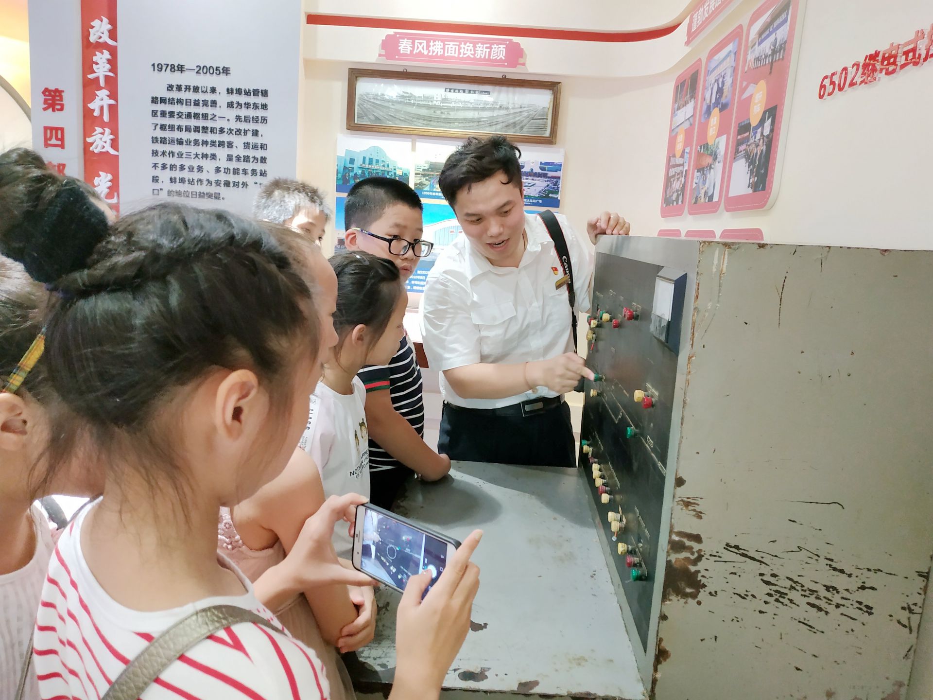 在蚌埠站站史陈列馆,郭剑在为学生们讲解。受访者供图