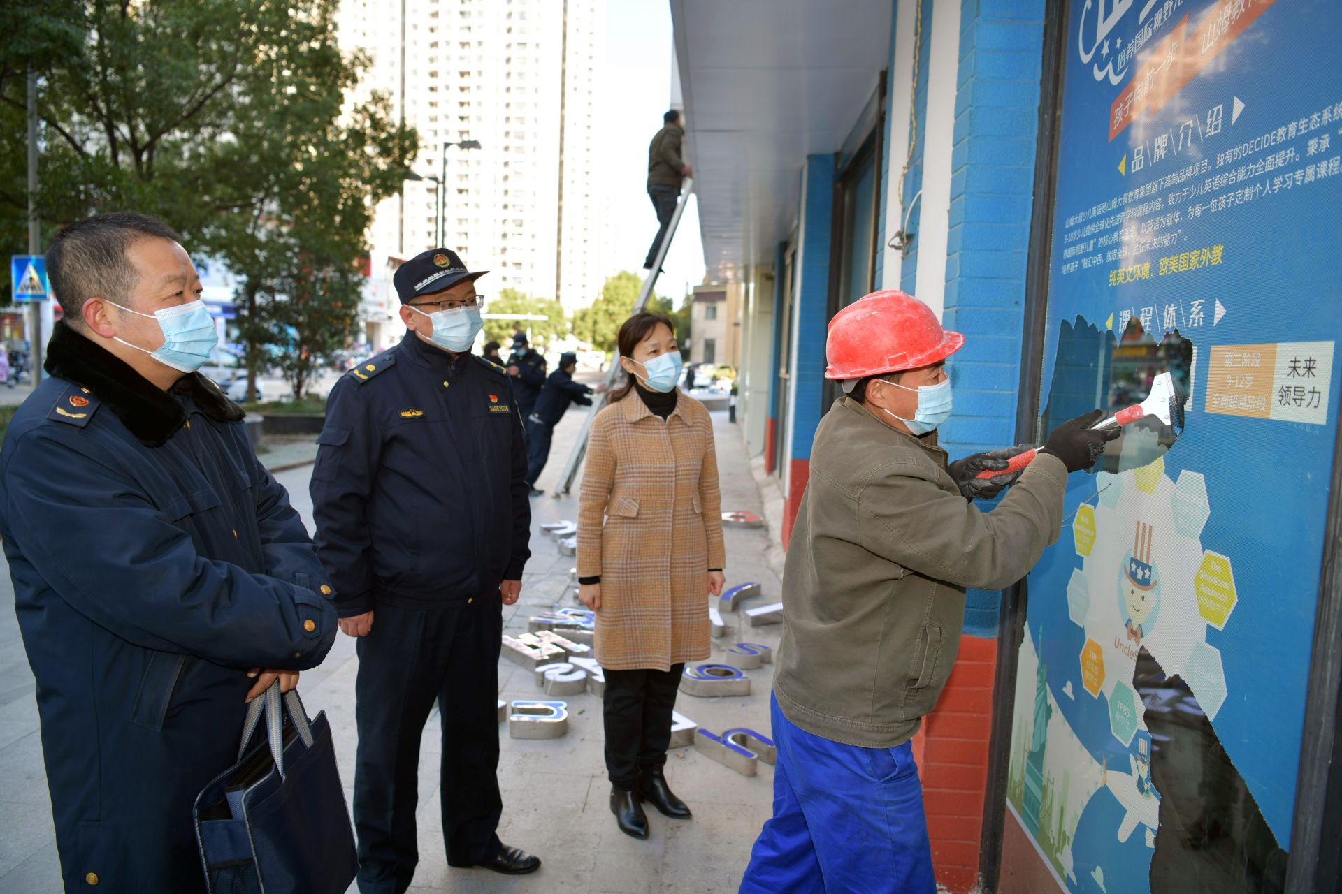 11月9日,市、区两级宣传、教育等部门分别在万达广场金街、宝龙城市广场对市区仍然存在的校外培训机构广告进行现场清理。
