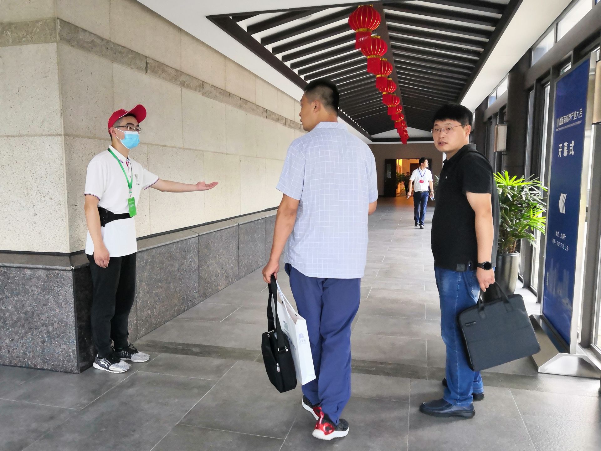 在国际新材料产业大会上,杜宏洋(左一)引导与会嘉宾。受访者供图