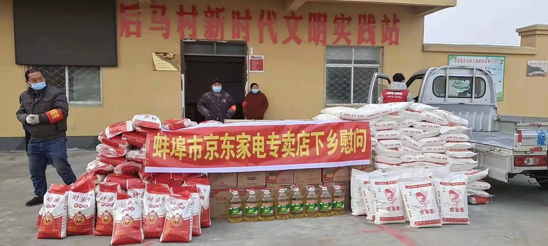 1月7日,一排悬挂“蚌埠市京东家电专卖店下乡慰问”旗帜的车队浩浩荡荡开进了后马,为村子捐赠了米、面、油等价值约2万元的慰问物资,在寒冷的天气给后马村送来了温暖的问候,传递关爱,汇聚温暖,彰显人间大爱!