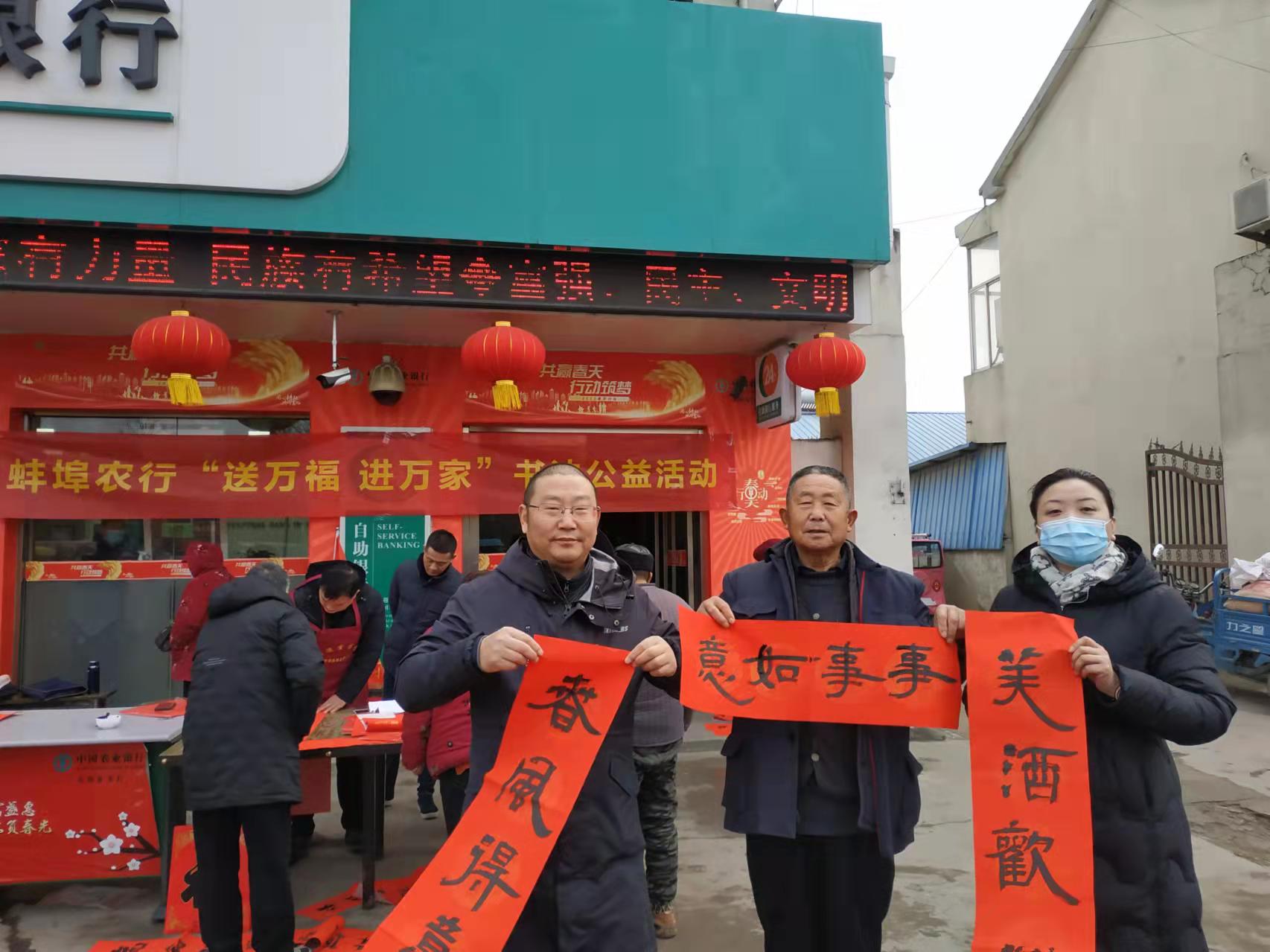 春节临近,年味渐浓,1月25日上午,农业银行蚌埠分行邀请知名书法家赴五河县沫河口支行开展“送万福 进万家”书法公益活动,现场书写春联并免费赠予群众。
