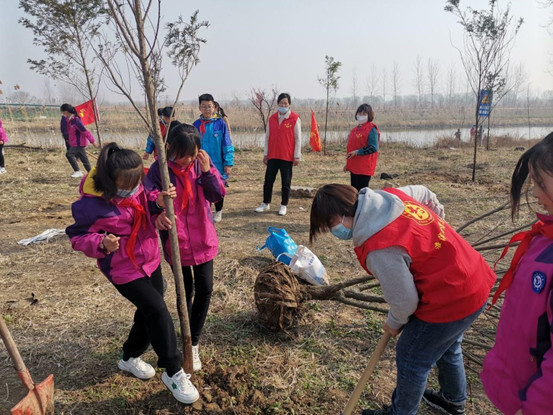 喜迎二十大,共植绿树林。参观完三岔河湿地公园展览馆后,大家开始植树活动,社区干群、蚌埠市第八中学师生拿起铁锹等工具,扶树正苗、把锹培土,认真地种下一棵棵小小爱心树。看着同学们一个个手忙脚乱的,有的赶着提水,给小树苗浇灌“春天的甘泉”;有的赶忙埋土,给小树苗盖上“暖暖的被子”;有的正在用木棍给小树苗架起“坚固的房屋”,经过一个多小时的植树活动,一排排新栽下的树苗昂然挺立,形成了一道靓丽的风景线。